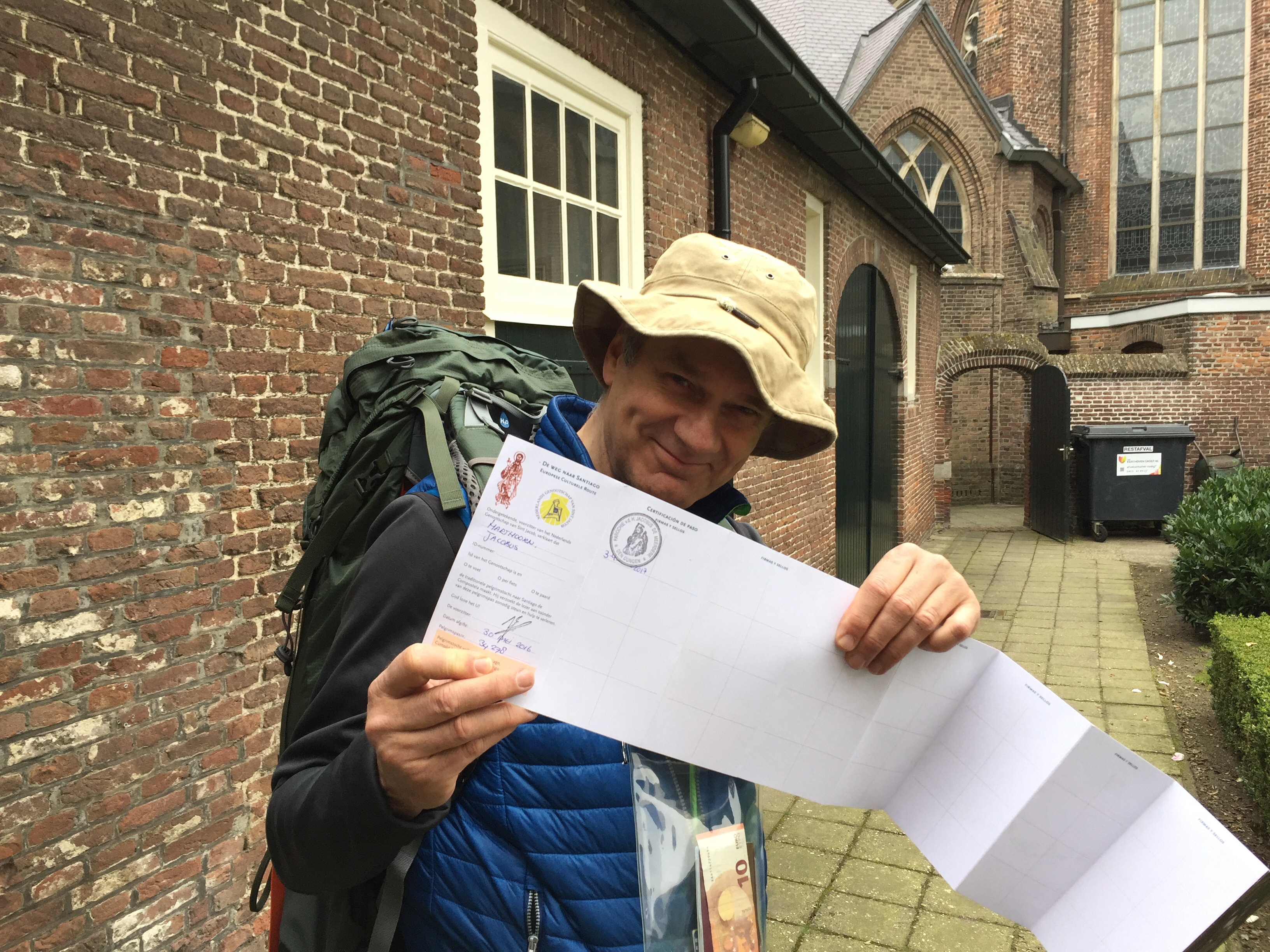 Een uurtje later zijn Erik en ik aangekomen bij de Sint-Jacobuskerk in Den Dungen, Verrassing: twee collega’s staan te wachten voor de kerk: Marten en Martin. De eerste stempel van Jacobus de Meerdere ontvangen we hier. De pastoor kon helaas niet komen om mij te zegenen, vertelde de vriendelijke mevrouw met de stempel.