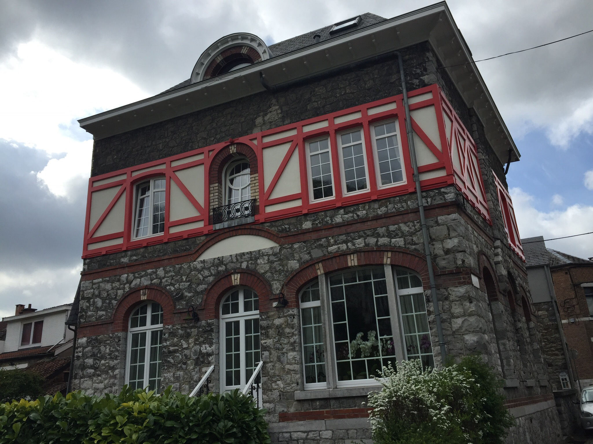 Gisteren heb ik in een Alpisport winkel nog wat dingetjes gekocht, zoals handschoenen. En die trek ik nu meteen aan. Ik ben er blij mee, want ik kan niet tegen koude handen, de huid wordt rood en jeukerig. Ander verstandig besluit is dat ik langs die mooie Maas – la Meuse, rivière fameuse, majestueuse – blijf lopen. Ik hou van de Maas. Een paar jaar geleden zijn mijn vriendin Marleen en ik tijdens vakantie op zoek gegaan naar de bronnen van de Maas. Het was een leuke ervaring om het beekje te zien dat later in Namen al zo immens breed is. Langs de Maas zie je veel bijzondere huizen vergane glorie, die onlangs weer zijn opgeknapt, zoals op de foto.