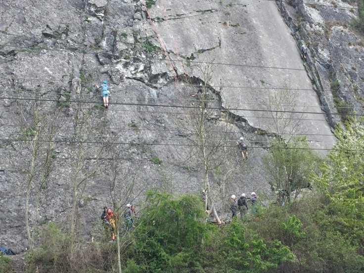 Voordat ik arriveer, kom ik langs hoge rotswanden waar bergbeklimmers aan het trainen zijn. Dat is toch wel een beetje griezelig, zunne. Maar goed, ieder z’n passie.