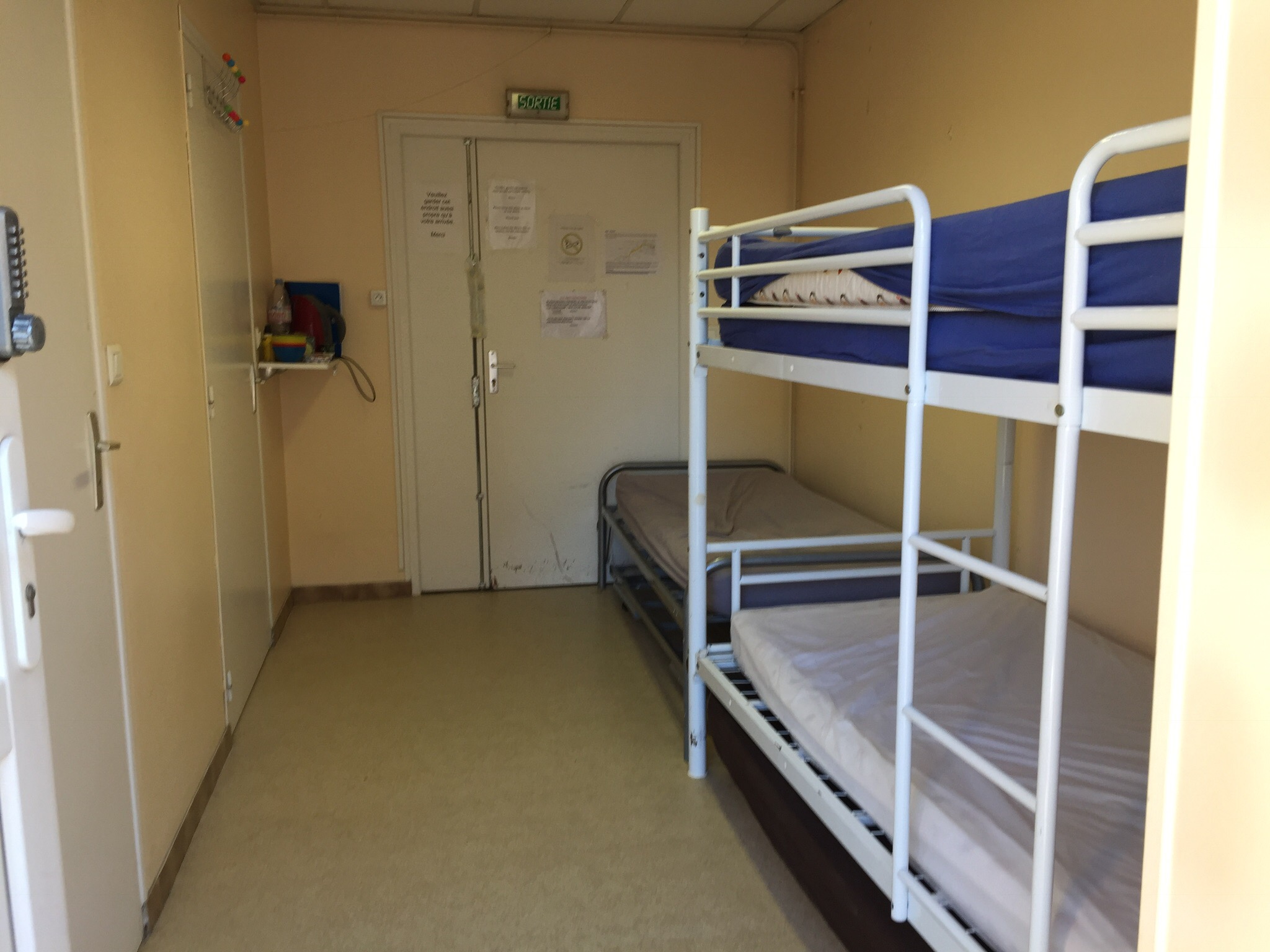 Na ontbijt met oploskoffie en een korte schoonmaak en opruimactie gaan we met z’n drieën op weg. Ik kijk nog een keer achterom en neem een foto van het hok (op de foto kun je het codeslot nog zien).
