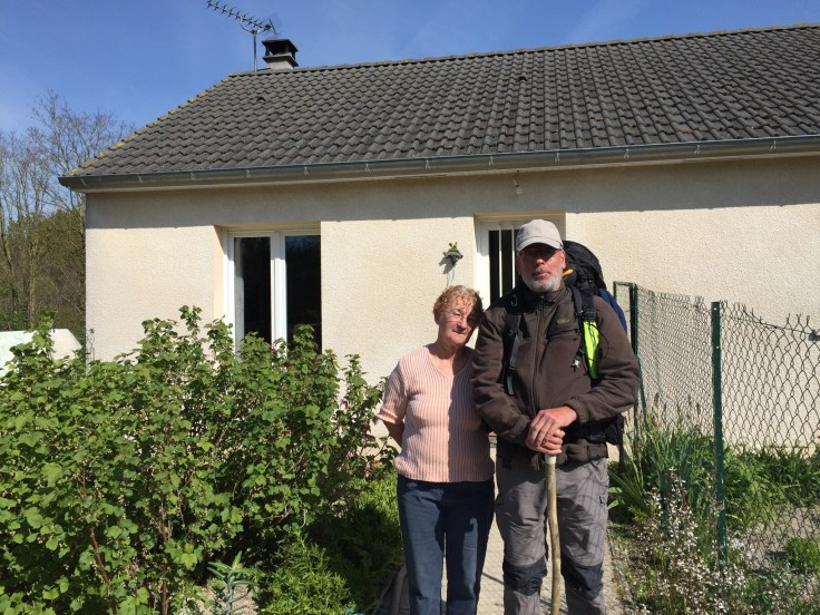 Al gauw blijkt dat Maria ervoor kiest om direct door te lopen naar Reims. Dat is 35+ km. Dus neemt zij een andere route en vandaag loop ik dus met Maurice. Wij lijken qua ritme toch redelijk op elkaar, dus dat loopt lekker. Het wordt een wandeling langs uitgestrekte landbouwvelden en kleine lege gehuchten. Als we door zo’n dorp komen, worden we plotseling toegeroepen. Een vrouw loopt vanuit haar huis naar ons toe en nodigt ons uit voor een koffie. Zo aardig! Nu krijg ik de mogelijkheid om iets te weten te komen over het leven in deze doodse dorpen. Ze is een vrouw van ongeveer 50+, heeft vier kinderen en nog meer kleinkinderen. Het dorp loopt de laatste jaren steeds verder leeg, de landbouw wordt steeds grootschaliger en jonge mensen trekken weg. In eerste instantie naar de stad: Reims. De landbouw produceert hier ten noorden van Reims rogge, suikerbieten, koolzaad en erwten als veevoer. De grond is zeer kalkrijk. Typisch is dat hier nog zero wijn (lees: champagne) wordt verbouwd. We bedanken de dame voor haar hartelijke ontvangst (ze heeft regelmatig ook pelgrims te slapen), de lekkere koffie en oploscappuccino en gaan ervandoor.