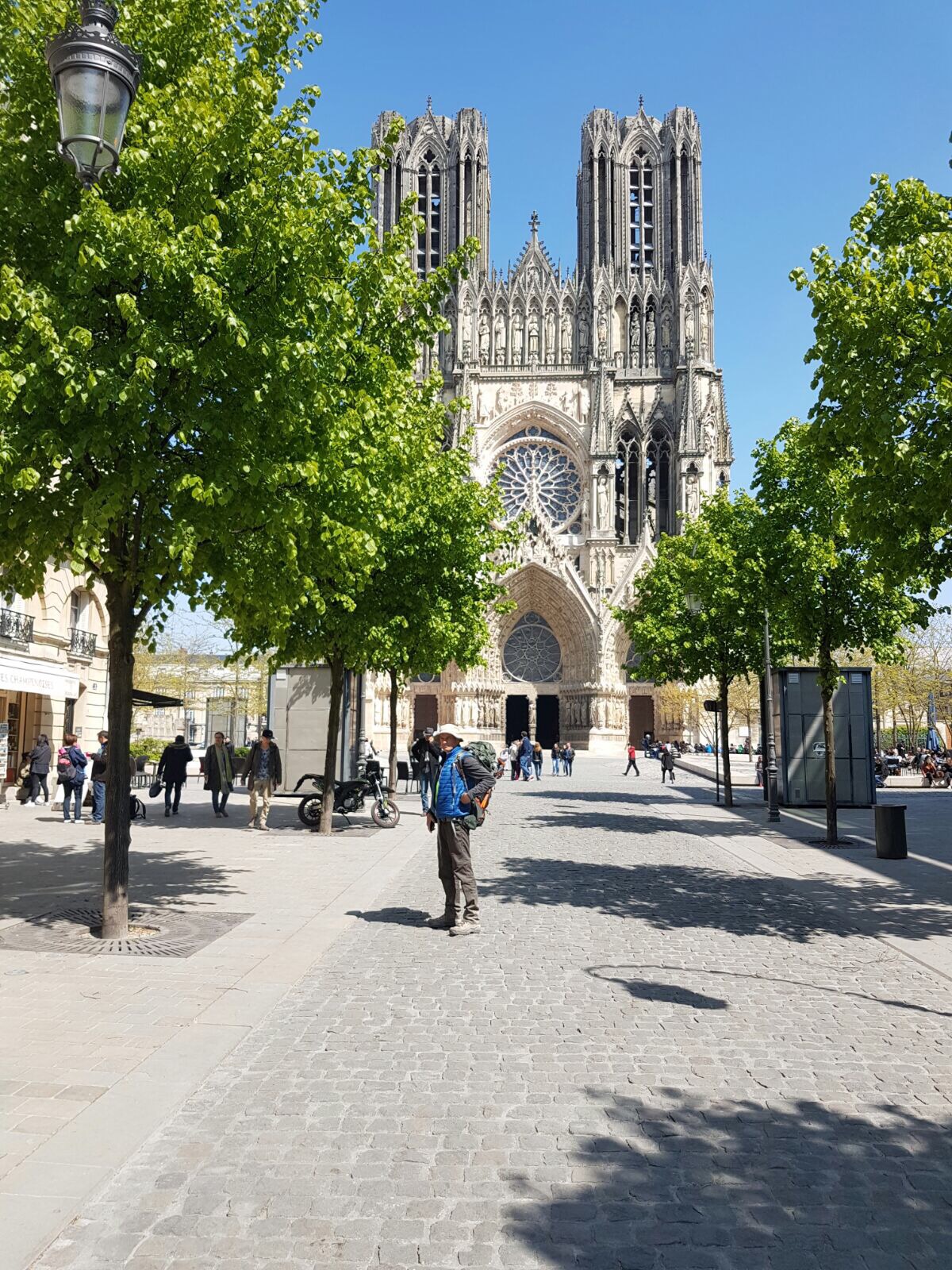 Na een lange wandeling door de voorstadjes en het historisch centrum, komen we aan bij die machtig mooie kathedraal van Reims. Je blijft maar kijken, mond open. En het contrast met het beeld van die ochtend in de ‘woestijn’.