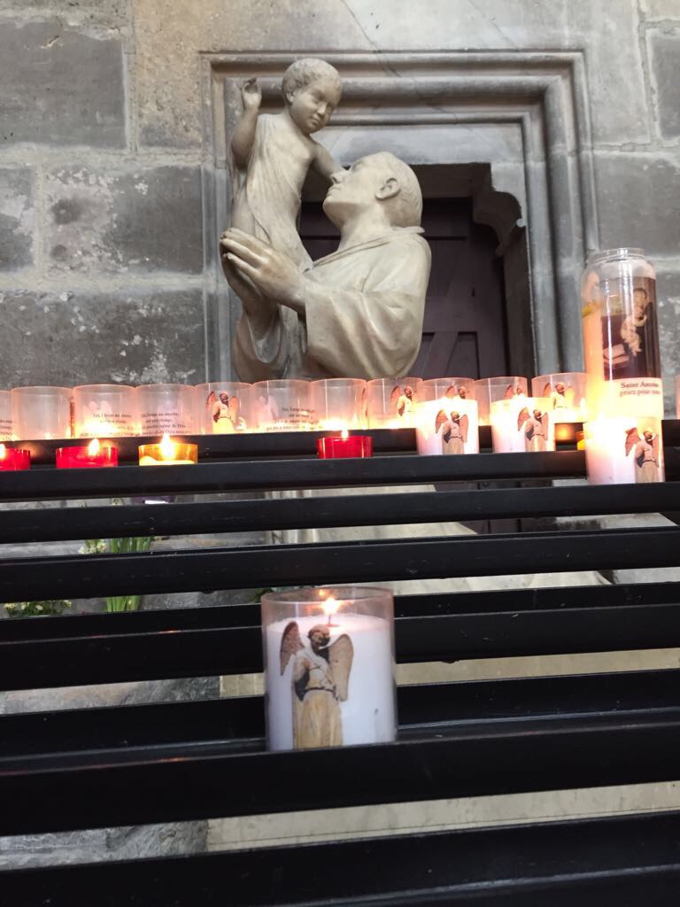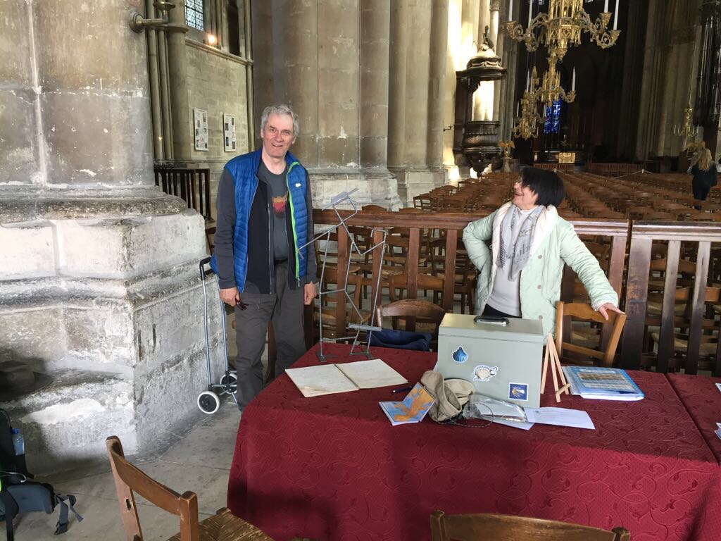 Door haar worden we welkom geheten in het mooie Reims, ze is onder de indruk van die grote kerels, wij krijgen de mooie stempel in ons boekje en ze regelt voor ons een slaapplaats in het Centre International de Séjour (CIS: aan te bevelen jeugdherberg). Dan maak ik mijn bezoek aan de kathedraal af met een kaarsje voor Karin.