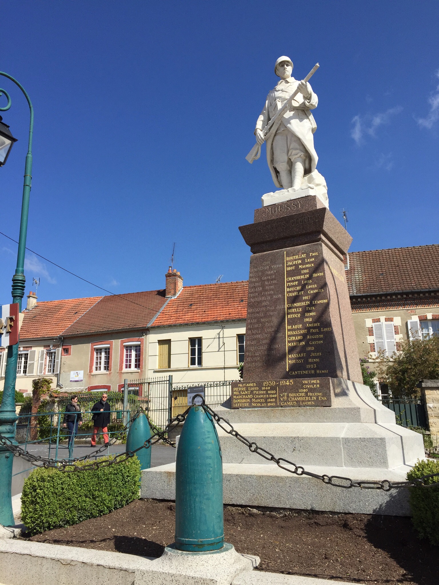 Na een paar kilometer lopen, stopt er een auto naast me. Het is Renault in zijn Peugeot. Hij heeft voor mij het pakketje Belgische wandelkaarten en -boekjes bij zich, die ik met opzet heb achtergelaten: niet meer nodig en minder gewicht. Ontzettend aardig, hij neemt alles weer mee. Je kunt zien in de dorpen dat men goed verdient aan de wijnteelt. Mooie huizen en klaar voor de toerist, die langs de champagne velden wil lopen waar hij later in een ‘cave’ het nodige zal inslaan. Maar ook hier steeds aandacht voor de tragische gebeurtenissen uit het verleden, de eerste en tweede wereldoorlog.