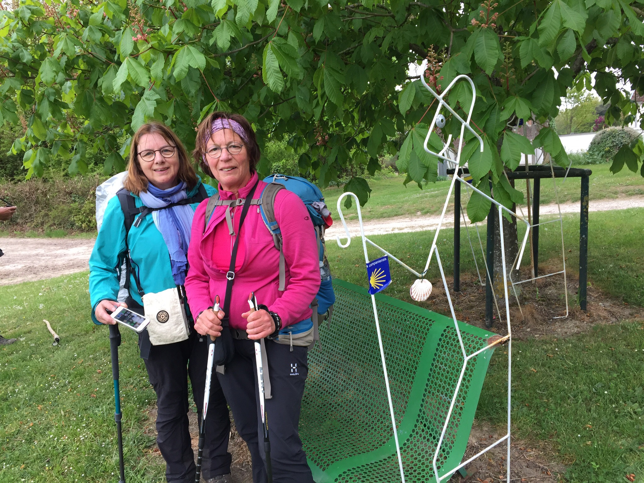 Na een bescheiden ontbijt in de eetzaal met de oudjes van het bejaardenhuis, gingen we met z’n vieren weer op pad. Zo leerden we de dames beter kennen. Beide werkzaam (geweest) in de sociaal-culturele sector, vriendinnen en samen het wandelen (met de stokken) ontdekt. Zij lopen elk jaar een flink stuk van de Camino, deze keer van Reims tot Limoges. De eerste korte pauze is bij een bankje waar de pelgrim met betonijzer in elkaar is geknutseld, versierd met stickers en schelpen. De Pelgrimstocht leeft hier.