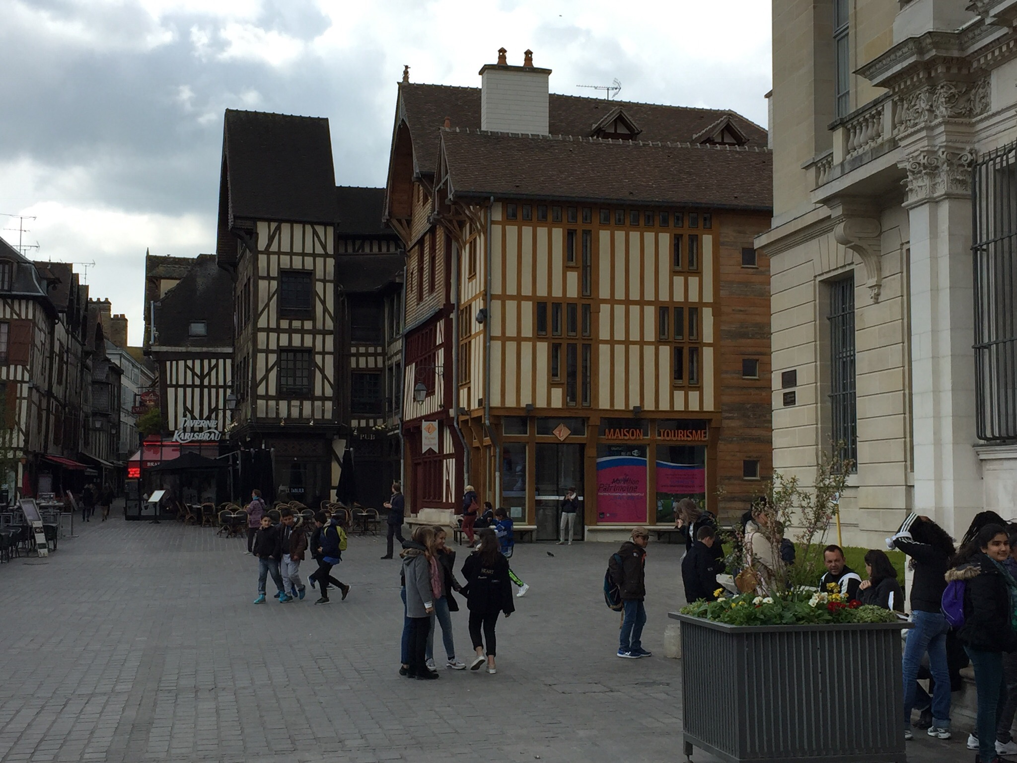 Troyes is heel bijzonder. Het heeft een middeleeuws centrum met vakwerkgebouwen: bruin eikenhout met daartussen wit pleisterwerk. Het is ook een gezellige stad, veel jonge mensen ook, kromme straatjes met voorovergebogen gevels die blijkbaar toch overeind blijven staan. Er wordt veel aandacht besteed aan deze gebouwen, men is er trots op. In het midden is het Bureau Touristique dat waarschijnlijk als enige in de moderne tijd is opgetrokken in de oude stijl: hier dus geen rare krommingen of scheve schuine vloeren. Hier, bij Toerisme hebben we extra gevraagd voor overnachtingsadressen. Het blijkt dat de adressen steeds schaarser worden en steeds vaker bezet zijn. Wij zijn ook gedwongen om de komende dagen van de oorspronkelijke route af te wijken, anders lukt het niet een slaapplaats vinden.