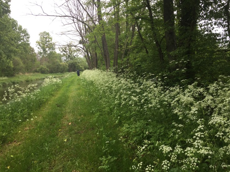De route verloopt helemaal langs een kanaal, eerst door bos en later in open gebied. Vrijwel gehele parcours hebben we regen. Kletsnatte schoenen in het hoge gras en bloeiend fluitenkruid; zo langzamerhand worden de sokken en voeten ook nat.