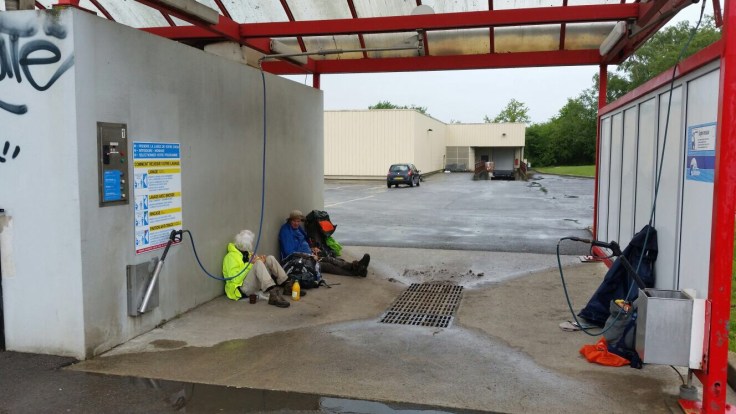 De lunch kopen we bij elkaar in het stadje Sancoins waar gelukkig een supermarkt open is. Bankjes om te zitten ontbreken, maar er is wel een groot afdak op de parkeerplaats: de carwash. Eet smakelijk!