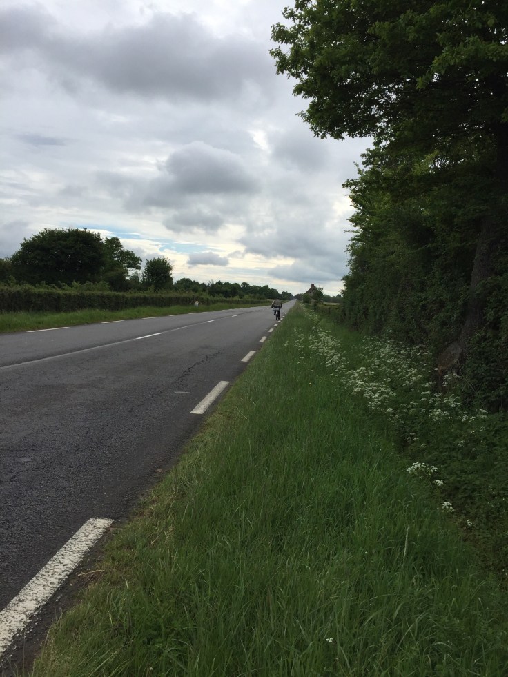 Mijn hoed is nog kletsnat (buiten laten liggen), maar ook mijn schoenen zijn niet geheel opgedroogd bij de kachel. Dat laatste is erger. Ik besluit daarom de route over het asfalt te nemen en niet door het natte gras. Het miezert ’s morgens. De asfaltweg is een soort provinciale weg die erg druk is. Geen leuke route, verstand op nul en blik op oneindig. Enige onderbreking is een Nederlandse automobilist die stopt met de vraag of hij mij naar een veiligere plaats van de wandelroute kan brengen. Ik bedank hem, maar ik ga op deze weg verder. Ik loop links en bij grote vrachtwagens of een drukke situatie ga ik ver van de weg af en diep het gras in. Een lunch op een bankje in een doodstil dorpje waar in het seizoen watertoerisme schijnt te zijn. Nu is het daar uitgestorven. Op de kilometerslange asfaltweg ontmoet ik een enkele fietser.