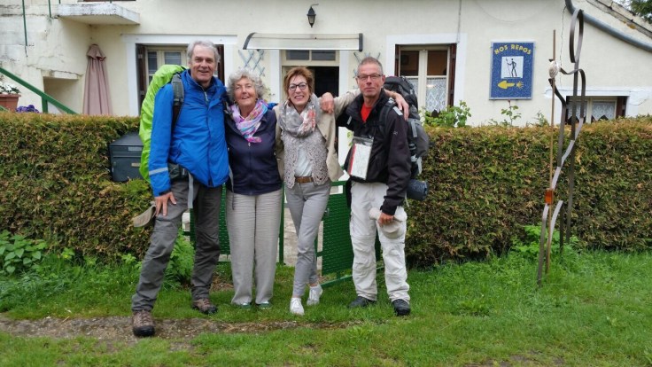 Op enkele kilometers voor de bestemming ontmoet ik weer Jos en Kiek die door de natuur een grotere afstand hebben afgelegd. Ik heb langzamer gelopen en bovendien een heerlijke salade genomen in een wegrestaurant. Als ik aan het kletsen ben met een paar Franse truckers, komen zij binnen. Dan lopen we verder en zoeken in het dorpje onze slaapplaats. Snel gevonden, maar er is niemand in of om het huis.