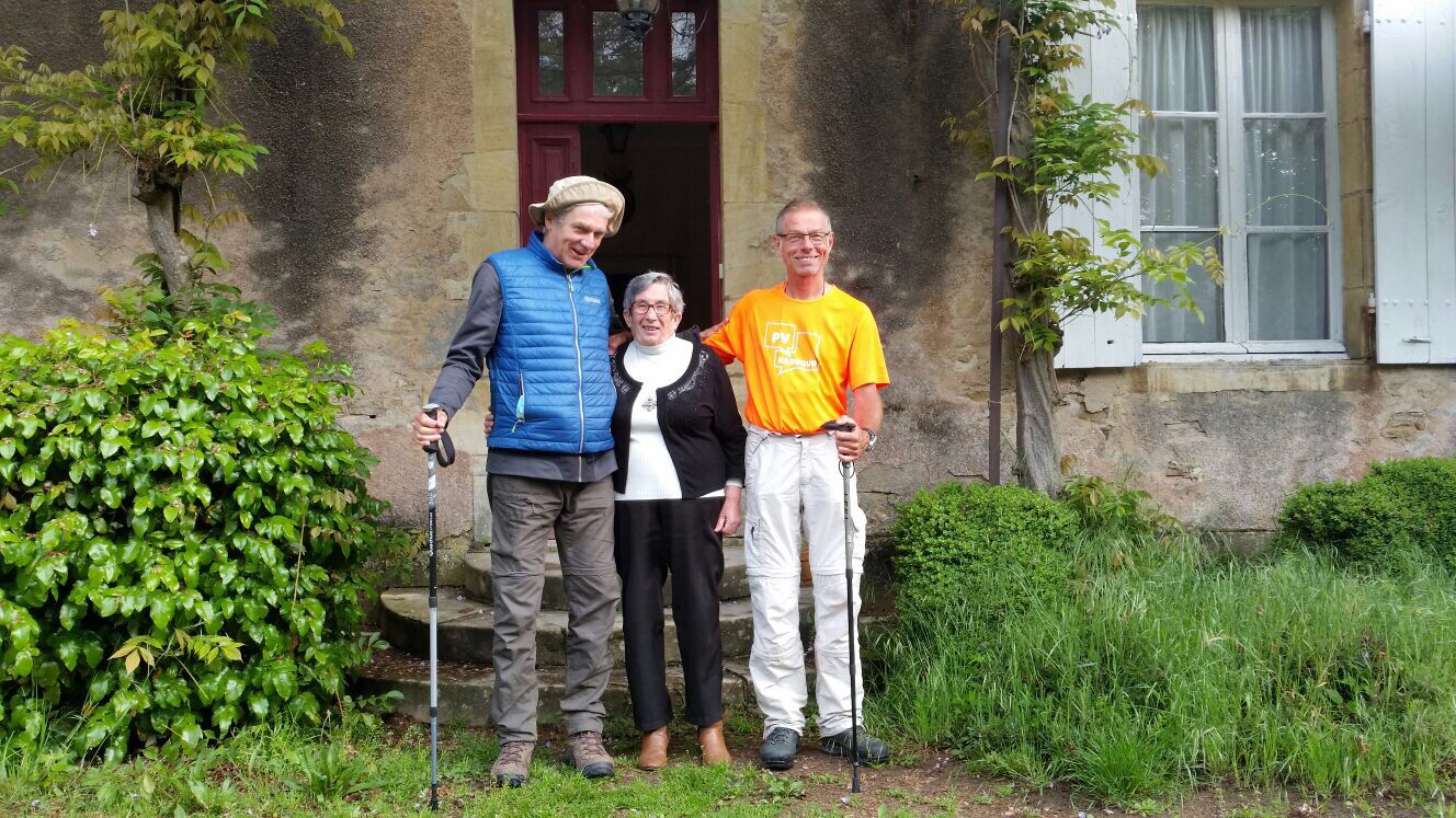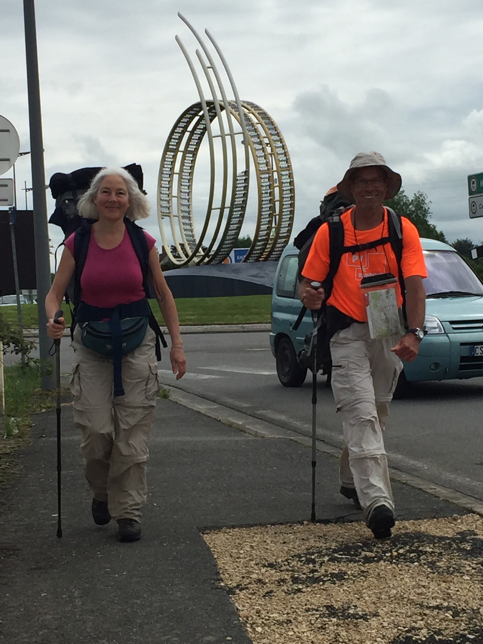 Al gauw komen we aan in het centrum, waar we gaan lunchen. Ik ga overnachten in dit stadje en Jos en Kiek gaan nog door naar een volgende plaats, ca 8 km verder. Afscheid nemen dus op het terras voor het restaurant. Op dat moment wordt mijn naam geroepen?! Het is Maria, de vrouw die ik een paar weken eerder voor Troyes ontmoette, toen ze ’s nachts met haar tentje in het bos had gekampeerd. Leuk weerzien, ze zit op het terras met een NL pelgrimma (voor drie weken) en met Annie, een Fransduitstalige pelgrimma (voor Santiago).