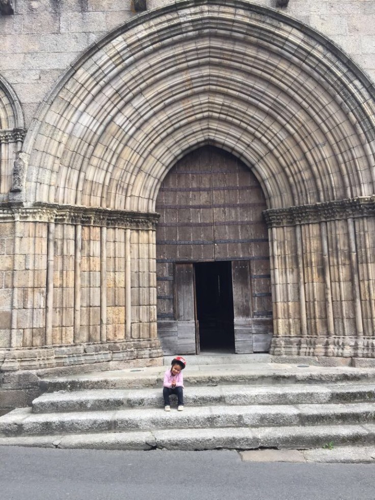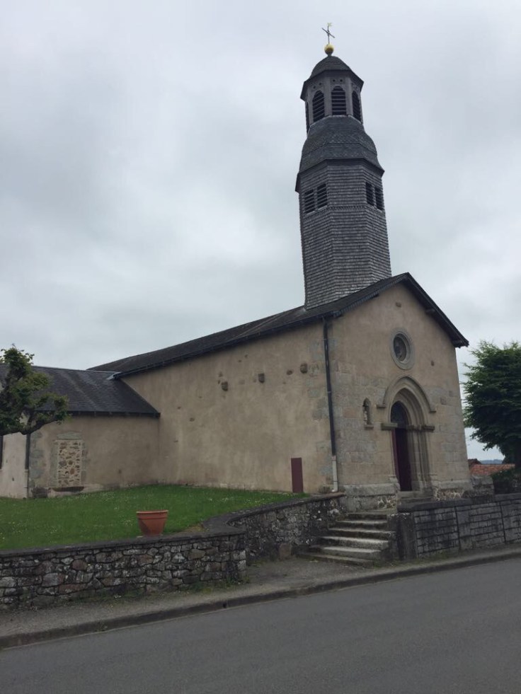 In het dorpje Le Châtenet-en-Dognon staat de deur open van een kerkje: sober en donker van binnen en een opvallende grote toren erop. Voor mensen om me heen een kaarsje aangestoken en een tijdlang op de kerkbanken uitgerust voor het vervolg.