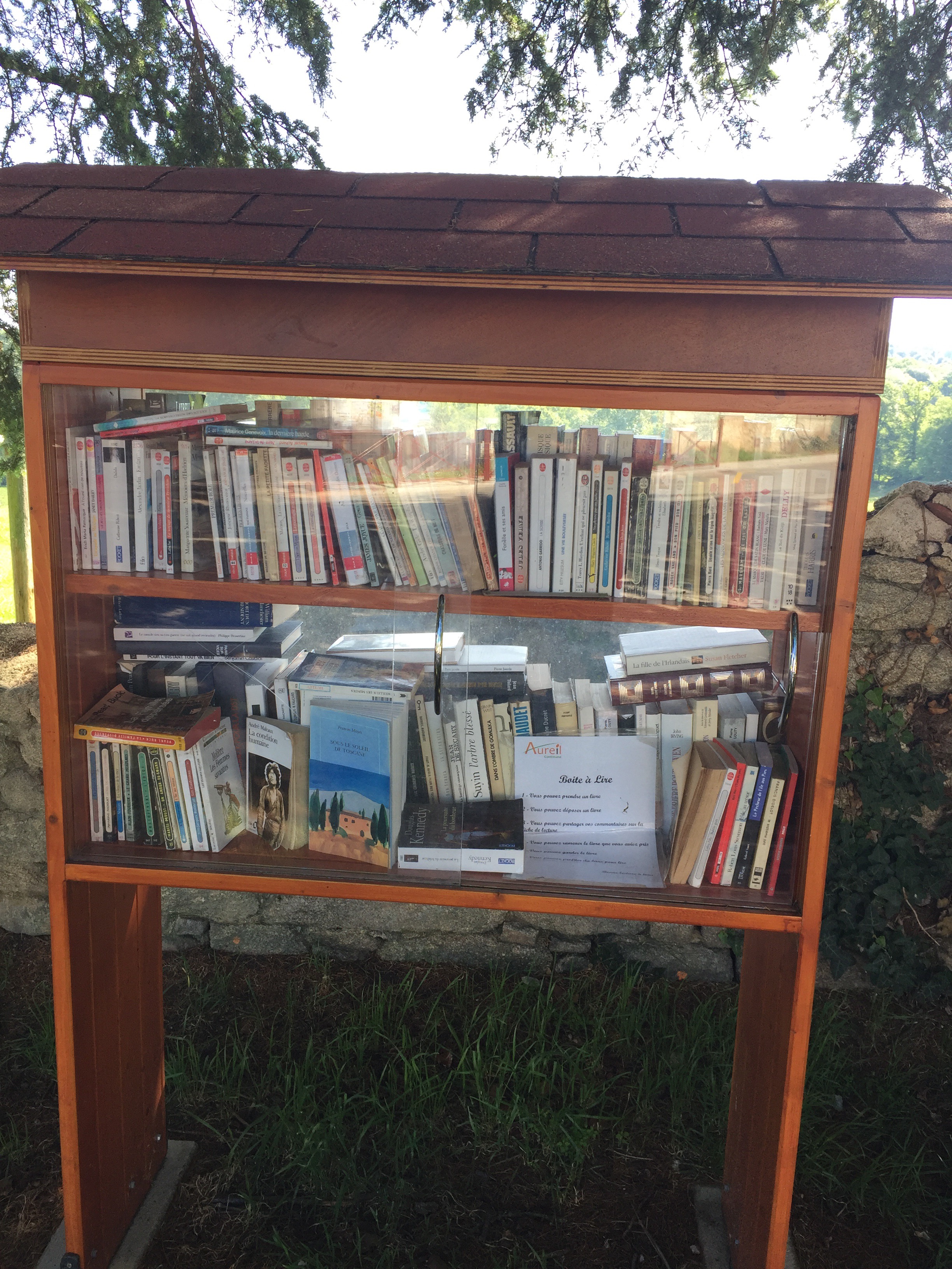 In het dorpje Aureil kom ik aan tijdens het speelkwartier van de basisschool. Naast het schoolplein is een schaduwplekje onder een boom met een bank! Dat vraagt om pauzeren en genieten van mijn pain met kaas, een appel en water. Naast de bank een boekenkastje met de uitnoding om te nemen en te lezen wat je maar wil. Lezen staat hier hoog aangeschreven.