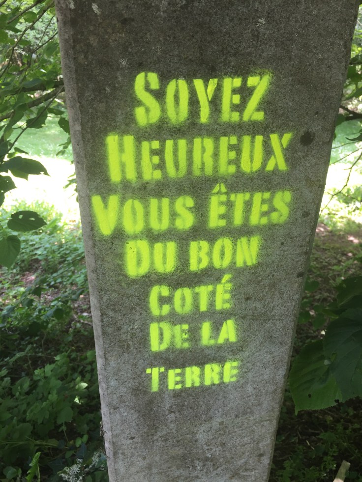Als ik zo het slingerende pad volg, zie ik ineens in felle gele kleuren een tekst staan. Vertaald: Wees gelukkig, u bevindt zich aan de goede kant van de grond (in plaats van er onder). Ja, alleen daarom mag je al blij zijn, dat je het leven hebt.