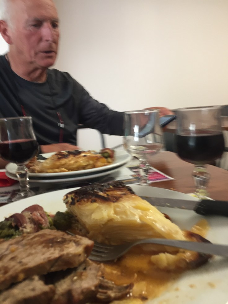 Ik ging toch maar eens zelf informeren. Resultaat was dat het restaurant gesloten was, maar… voor pelgrims zou hij toch open zijn van 19.00 – 20.00 uur. Toch een aparte status, zo’n pelgrim. Dus wij voor ca. 12 euro een heerlijke maaltijd genoten van vele restjes met veel vlees, gebakken aardappelen, wijntje erbij en ijs toe. Grote meevaller. De Spanjaard snapte er niks van. Ik kon het ook niet uitleggen. Ik viel snel in een diepe slaap, hij snurkte mij af en toe wakker.
