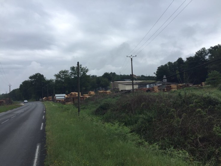 Na het onweer van vannacht is het kouder geworden. Achter elkaar gaan we op weg. Mijn ontbijt bij de boulangerie heb ik na een paar happen weggelegd. Ik heb banaan, een appel en een sinaasappel voor onderweg. Ik voel me niet optimaal. Na ongeveer 10 km heb ik dan m’n banaanstop, in een schuilhutje bij een houtzagerij. Het is dan nog droog, maar erg dreigend met die donkere wolken. Franse medepelgrim komt voorbij, bonjour! De banaan vult lekker en ik ga weer op pad.