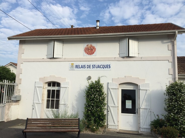 Na een bezoek aan de kerk en een grand café au lait op een terras, loop ik de Office de Tourisme binnen. Ik krijg te horen dat reserveren van pelgrimsplaatsen vanaf nu niet meer mogelijk is. In Hagetmau moet ik de sleutel gaan halen bij het gemeentelijk zwembad. Ok. Ik knoop dat in mijn oren. Ik ga verder en volg de schelpentekens in de grond.