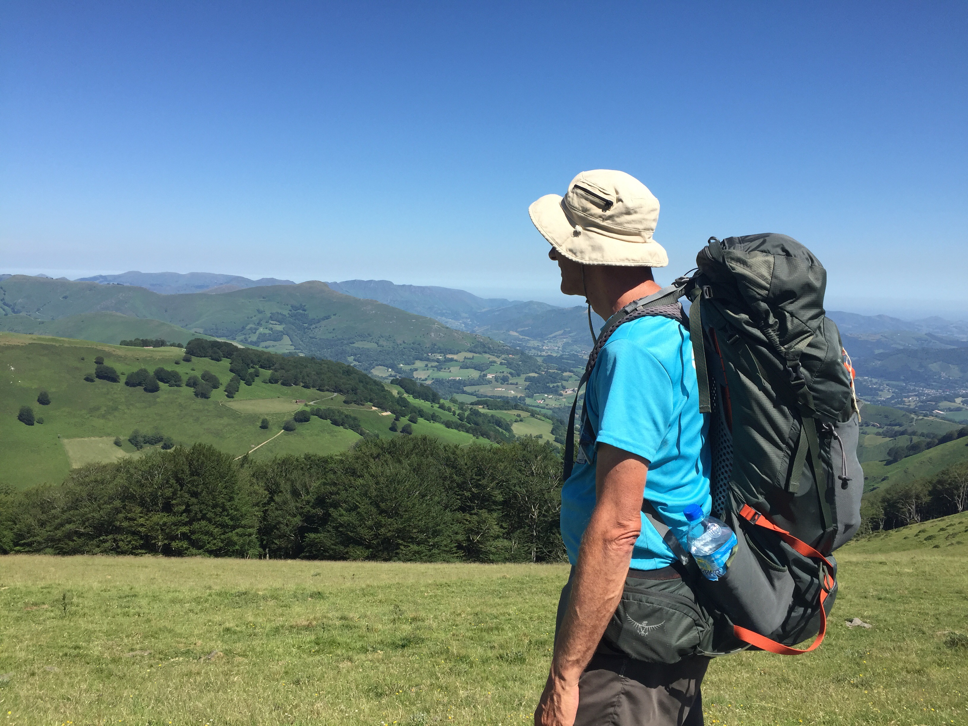 Met tussendoor wat kortere en langere rust- en drinkpauzes blijven we stijgen. Op een panorama-uitkijkplaats waar je op zo’n bord kunt zien waar welke bergtoppen en plaatsen liggen, staat ook een picknicktafel. Daar ontmoet ik pelgrims uit Friesland. Zij had de Camino vorig jaar gelopen vanaf thuis, nu gaan ze samen vanaf Saint-Jean-Pied-de-Port. Sterke mensen. Ook ontmoet ik een Engelse vader met dochter; hij stapt heel rustig de helling op, zij heeft het zwaar maar zet door. Als ze naast elkaar op een vlak stuk voor mij uit lopen, zie je hoe bijzonder zo’n natuurlijk verbond is. Ik denk natuurlijk ook aan mijn dochter Sofie.