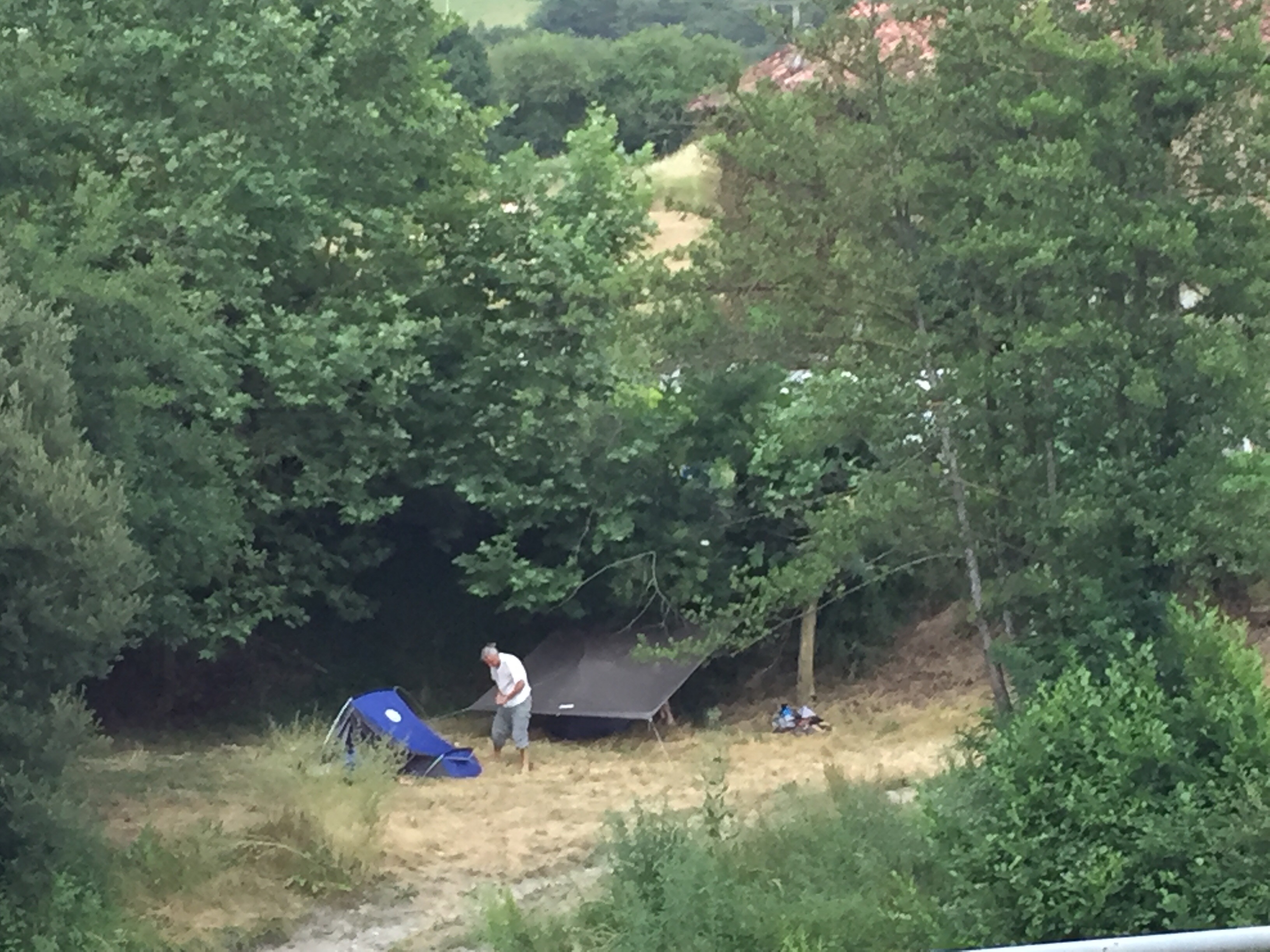 We gaan er weer tegenaan. De hitte tegemoet. Aan de rand van Zubiri zie ik dat door een paar pelgrims vrij wordt gekampeerd.
