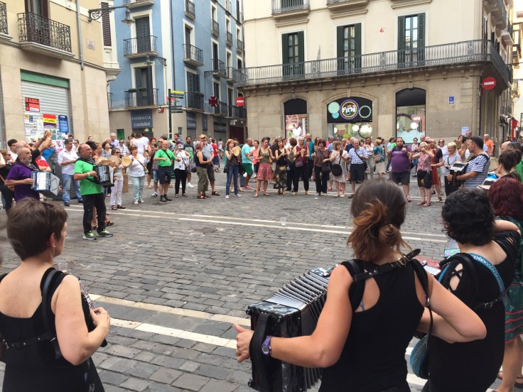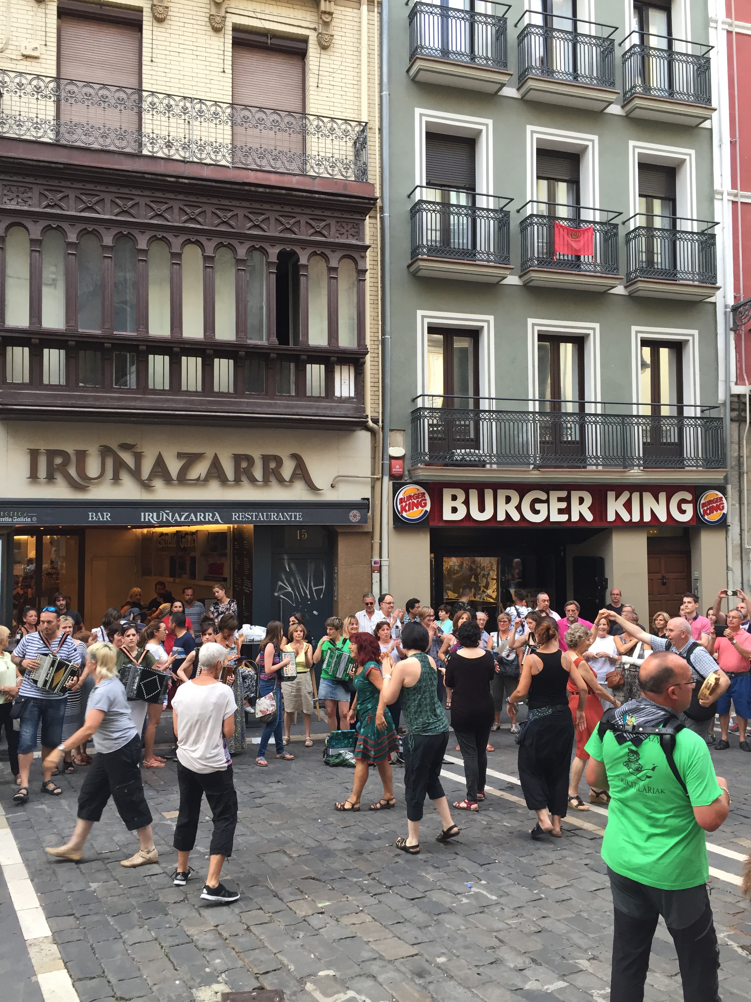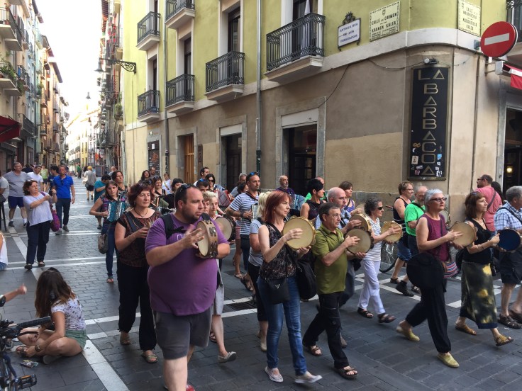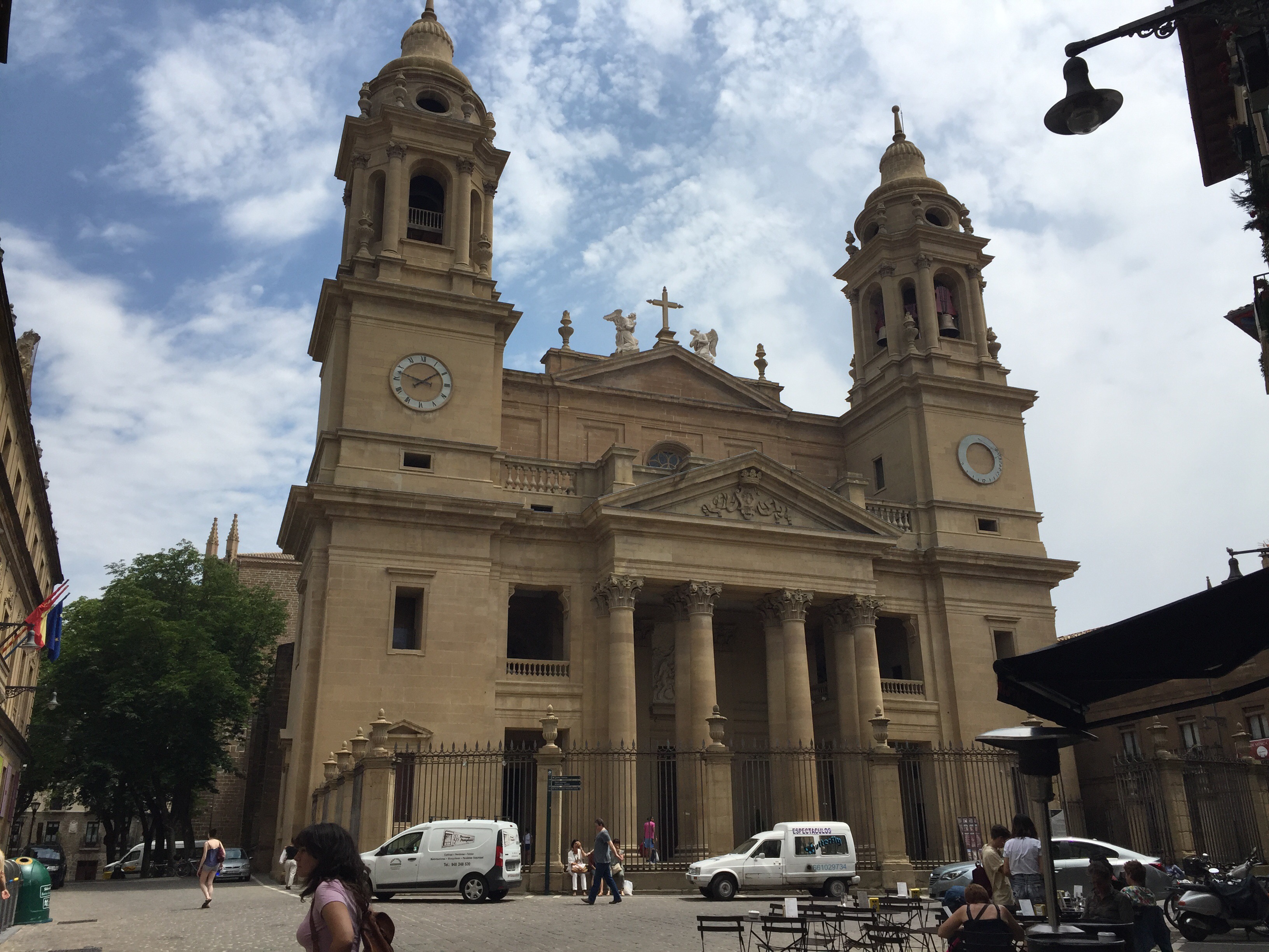 Ik had de pelgrimsherberg Jésus y Maria uitgekozen voor de overnachting, midden in het historische centrum. Ik heb van vijf tot negen alleen maar door de straatjes gewandeld en genoten. Rond zes/zeven uur kwam ik op het grote plein waar vier mannen met wit overhemd en rood sjaaltje in een muziektent oude Spaanse liederen ten gehore brachten met trommels en oude fluiten. Aan de rand van het plein zaten de oudere generaties te genieten. Terug in de straatjes kom ik op een plein waar alleen maar jongeren zitten. Op de stenen grond van de straat. Spanjaarden houden van veel en vaak praten. Iedereen heeft een drankje vast, er wordt nog niet gegeten.