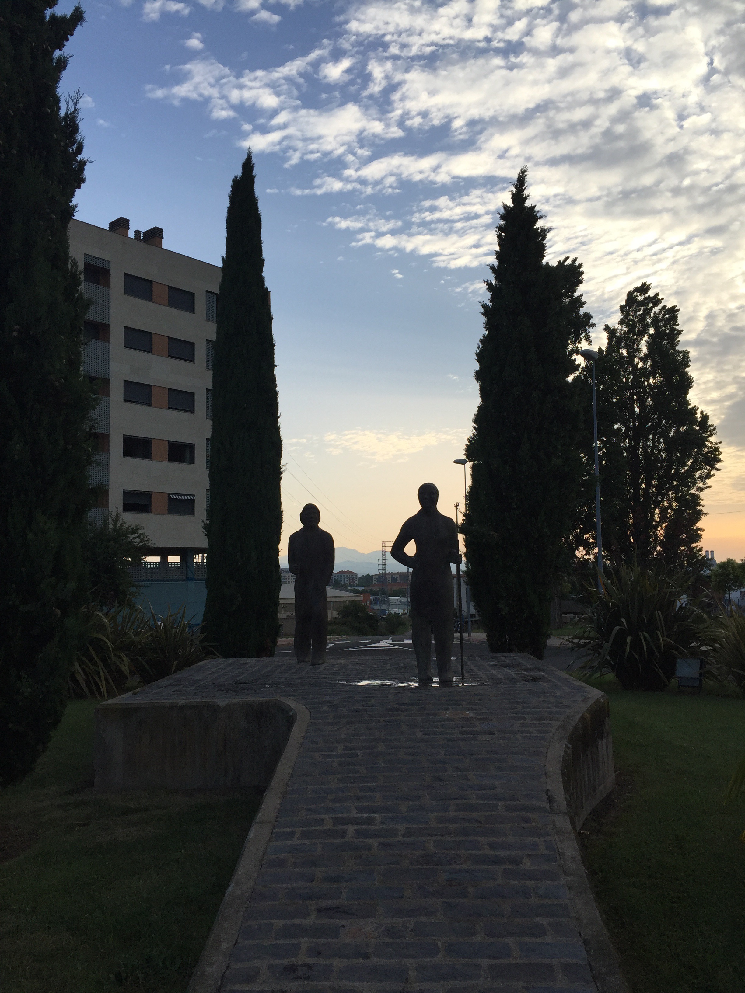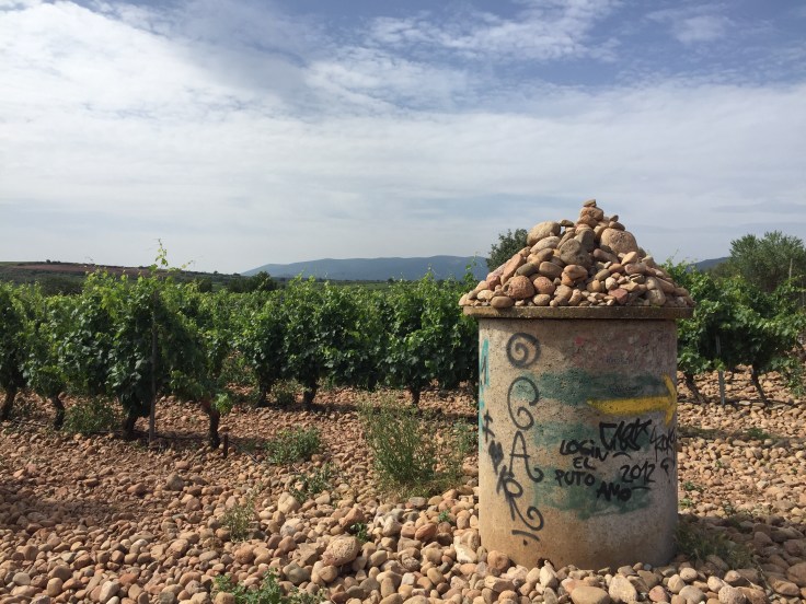 Het parcours is volgens de boekjes makkelijk. De meest opvallende plekjes zijn vooral wat mensen hebben neergezet langs de weg. Dat stuk loopt op een of andere manier heel relaxed, je kunt rustig om je heen kijken en praten over wat je ziet. Niet druk maken over de juiste weg, niet naar beneden kijken op struikelpaadjes. Nadat we een ruïne van een hospitaal voor pelgrims passeren, zie ik de naam Don Jacobo staan.