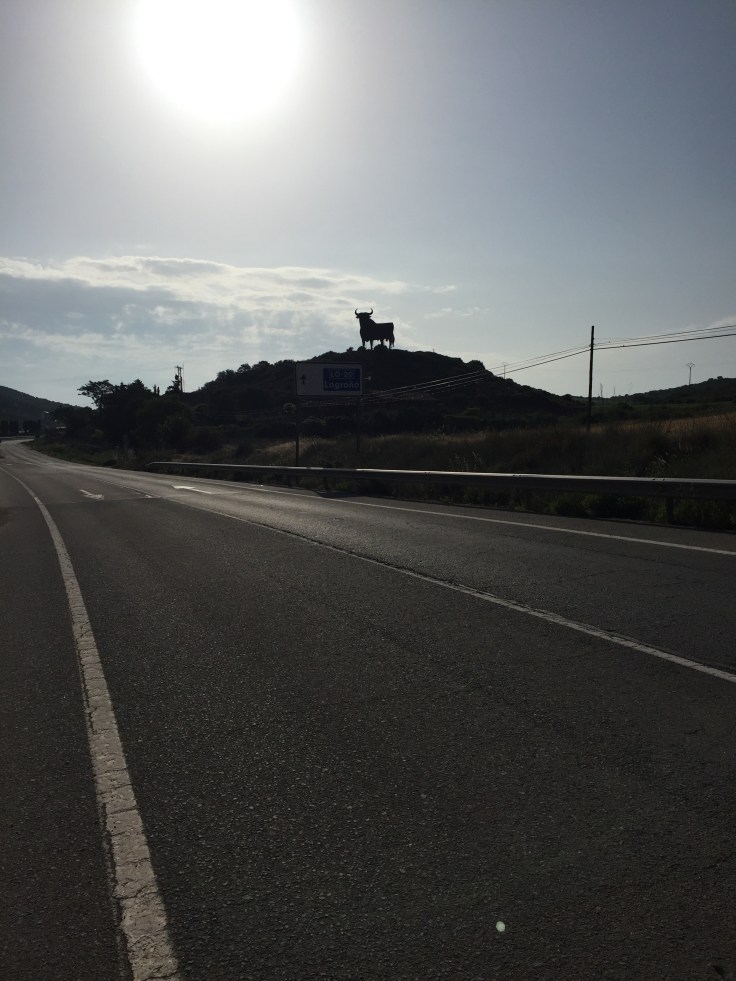 Eerst krijgen we een lange wandeling langs een recreatieplas. In het aangelegen dennenbos blijven konijnen en eekhoorns gewoon zitten als je er vlak langs loopt. Maar het grootste beest dat niet beweegt, zie ik halverweg de ochtend boven op een berg: de beroemde stier van Osborne. Het pelgrimspad gaat er vlak langs, maar op afstand bij een lage zon komt hij heel mooi in beeld.