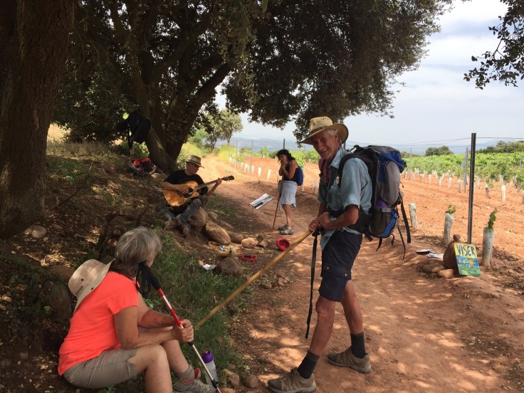 Kilometerslang volgen we dit landschap totdat we een schaduwplekje vinden met alweer een Spaanse gitaarman. Mooie muziek. Dan breng ik Peter en Marjorie uit Zuid-Afrika en Mariana uit Argentinië bij elkaar in een gesprek over de geologie. Naar aanleiding van de hoogvlaktes in de Rioja, vertelde Mariana (geologe) over onderzoek dat zij had gedaan in de hoogvlaktes van Argentinië (Patagonië). Gebleken is dat er grote overeenkomsten zijn met de beroemde tafelbergen in Zuid-Afrika: dezelfde gesteenten met dezelfde fossielen uit dezelfde geologische periode. Argentinië en Zuid-Afrika hebben in de vroegste geologische tijden aan elkaar vast gezeten. Leuk om zo met deze mensen uit deze landen over dit verschijnsel te praten.