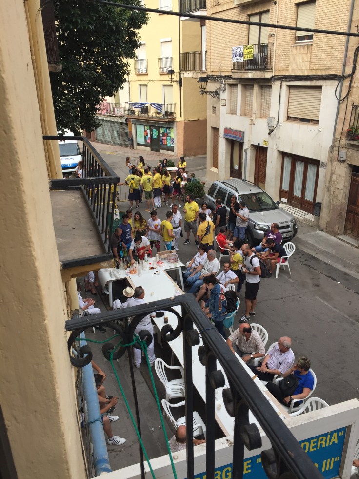 Ik ga heerlijk buiten eten, daarna gaat het regenen en wordt het buitenfeest wat minder. Maar later, rond middernacht als het weer wat droger wordt, wordt het feest weer hervat. Ook onder mijn balkon. Ik slaap natuurlijk niet zo geweldig, maar alles beter dan snurkers die me wakker houden. In Spanje is een feestdag werkelijk feest, in Frankrijk is een feestdag dat men niet werkt en de restaurants, cafés en winkels gesloten zijn. Wat dat betreft: liever Spanje dan Frankrijk. Nog een feestfoto.