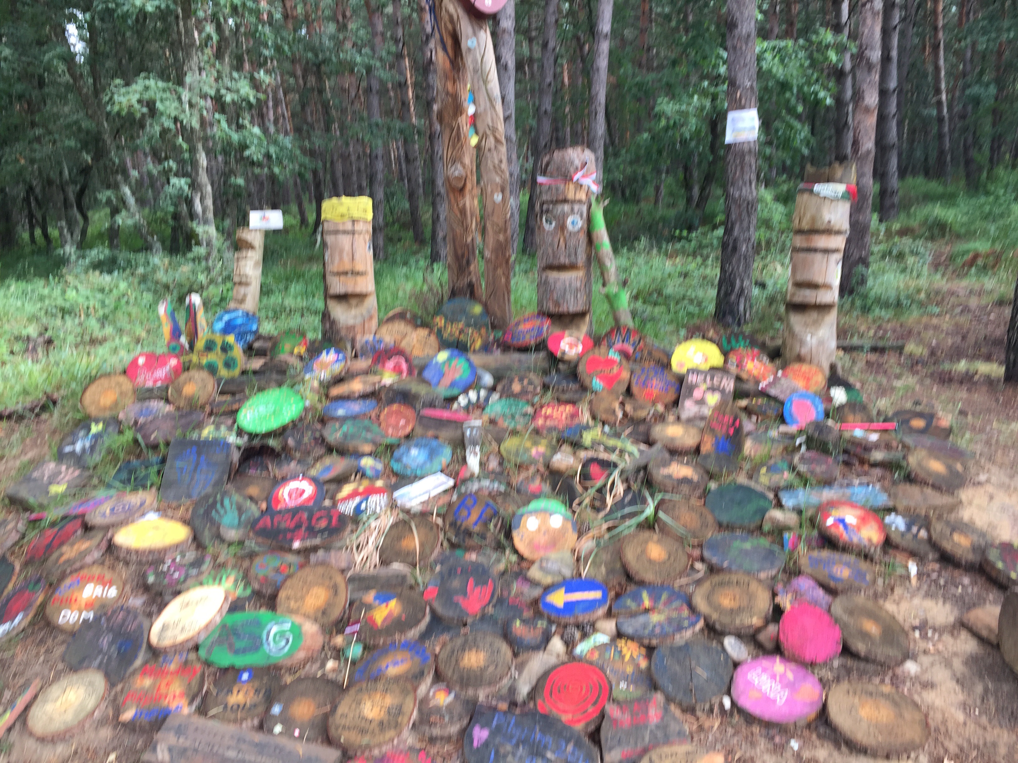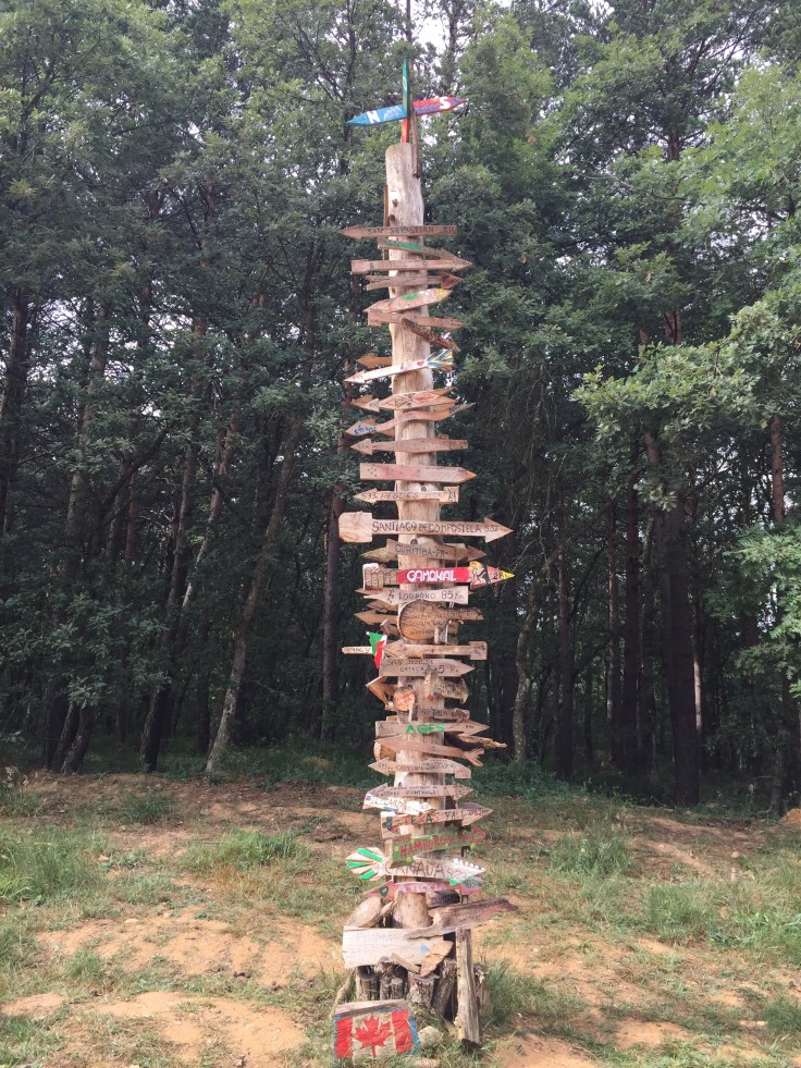 Even verderop bevinden we ons ineens in een oase voor de pelgrims. In een open plek staan allerlei houtsnijwerken van picknicktafels tot totempalen en wereldomvattende wegwijzerborden. Ik lees o.a. Santiago nog 532 km.