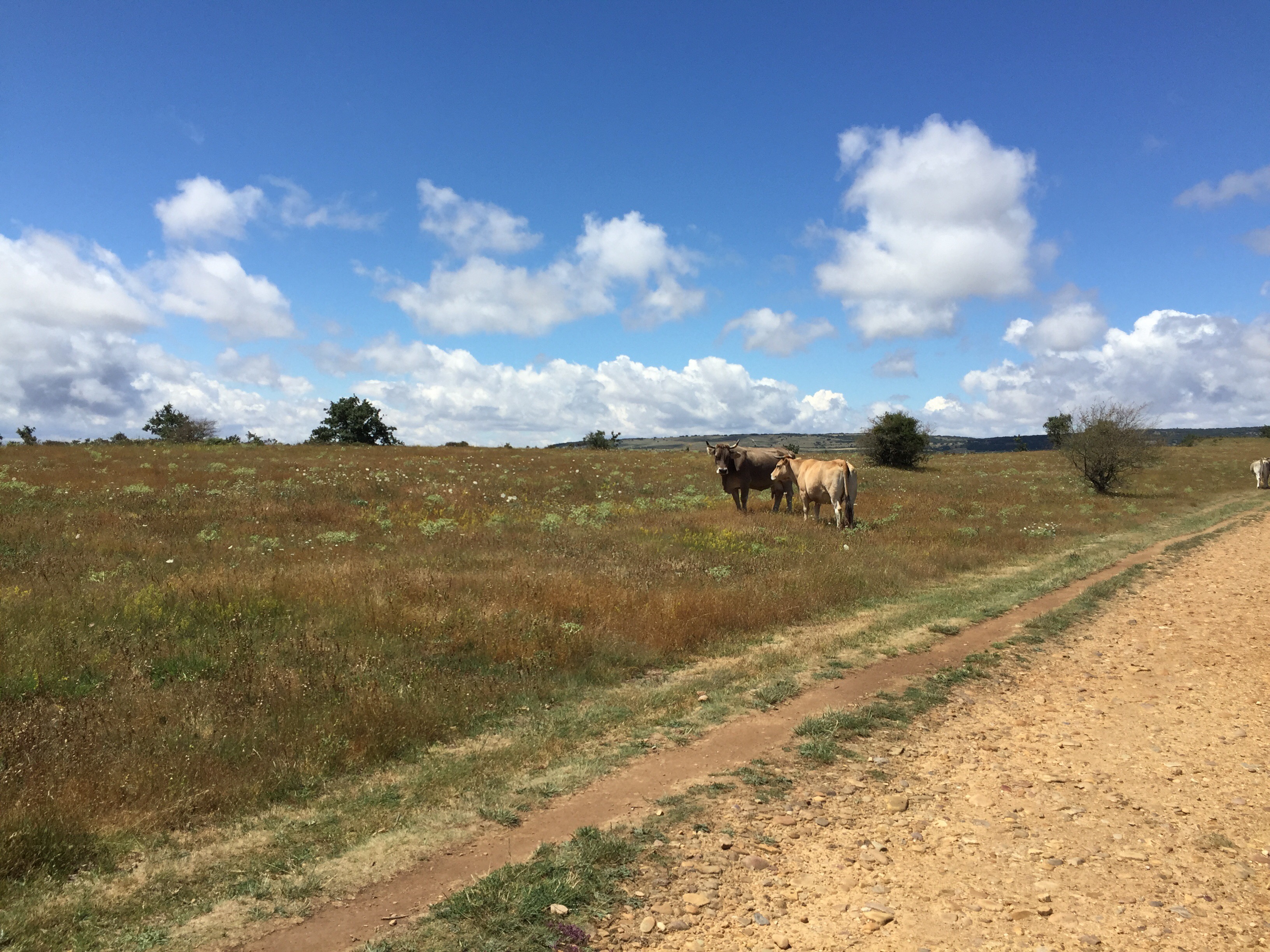Na deze houtkunst volgt er een heel lang en breed pad zwak hellend naar San Juan de Ortega waar ik eerst zou gaan slapen. Maar het gaat allemaal zo goed en het weer begint op te klaren. De zon begint steeds meer te schijnen. Dus ik besluit een dorp verder te reizen. Naar Agés. Het pad loopt langs weilanden waar koeien gewoon los lopen te grazen of bijeen staan onder een boom. Ze vinden die voorbijlopende pelgrims heel gewoon en zeker niet bedreigend.