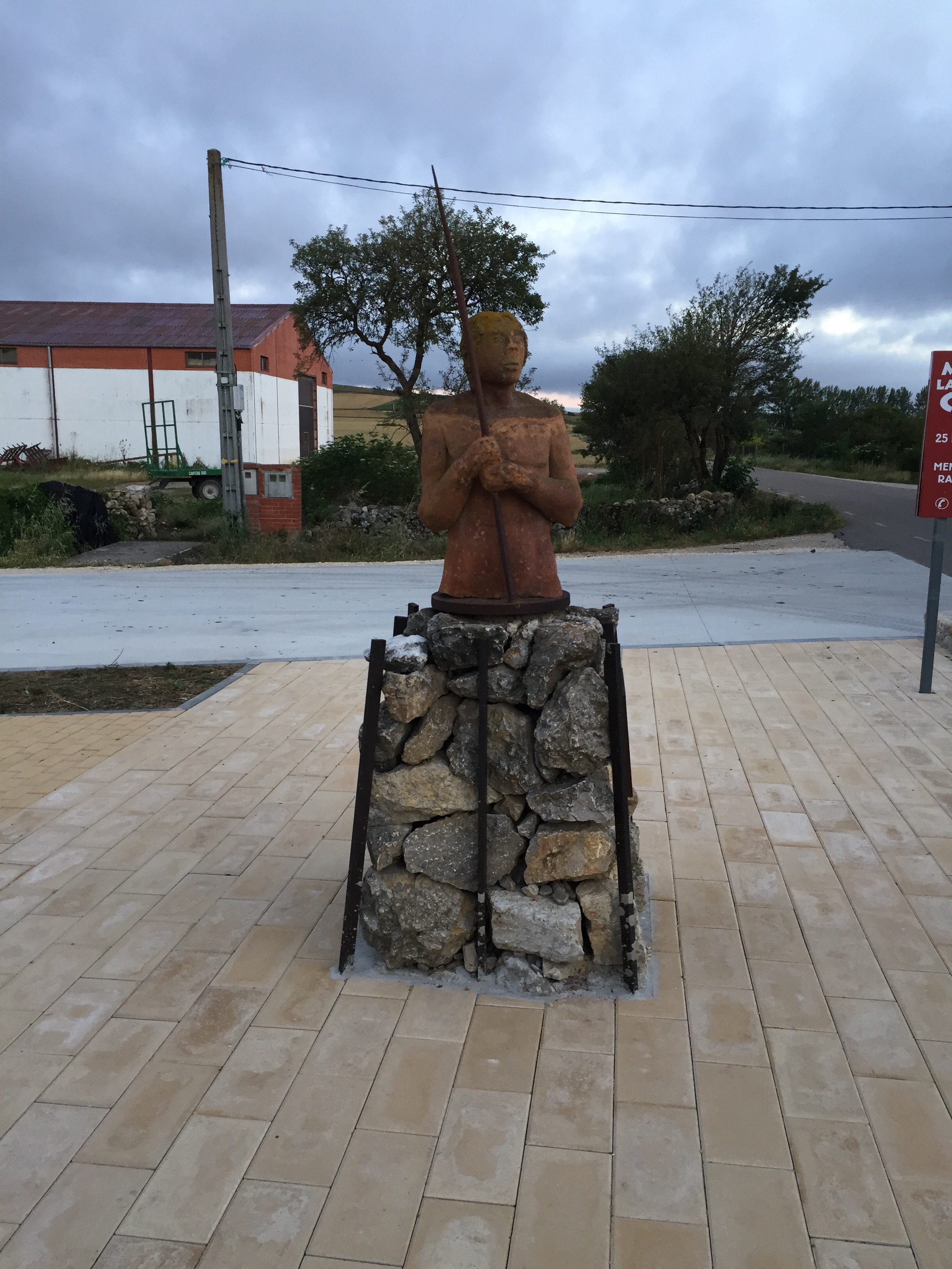 Het is koud en regenachtig. Geen snurkers vannacht. Iedereen is een beetje vroeg op om naar Burgos te vertrekken. Warme kleren. Als ik het dorpje verlaat, kom ik langs een beeld dat de oudste Europese mens moet voorstellen. Hoe een dorpje van niks in het wereldnieuws kwam.