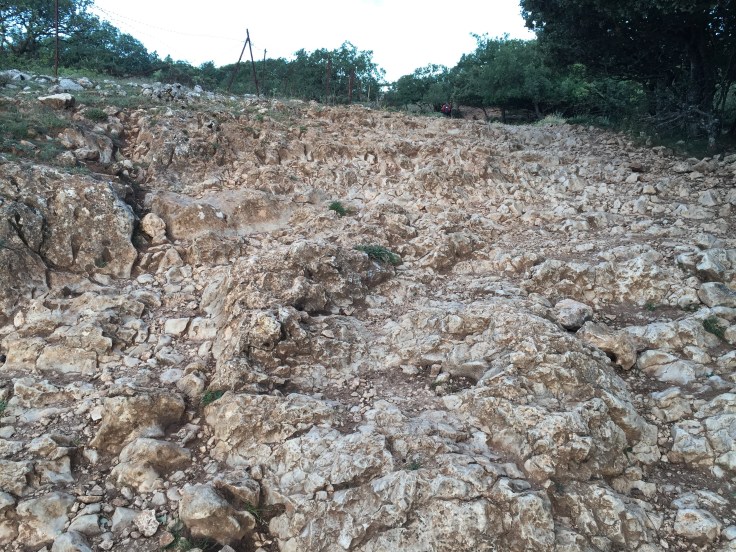 Linksaf het bos in en langzaam stijgen tot aan de plaats waar het kalkgesteente aan het oppervlakte komt. Zeer moeilijk begaanbaar, lastig met die hoekige rotsen. Heel langzaam kom ik vooruit tot waar het vlakker wordt.