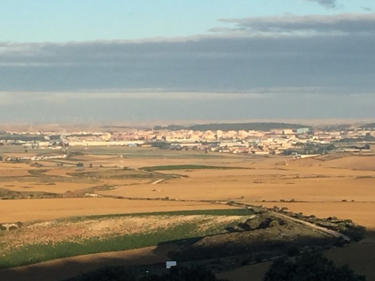 Nog een tijdlang over de hoogvlakte en dan zie ik aan het eind van een lange kronkelige weg de grote stad Burgos liggen. De lucht is schoner geworden, je kan heel ver kijken.