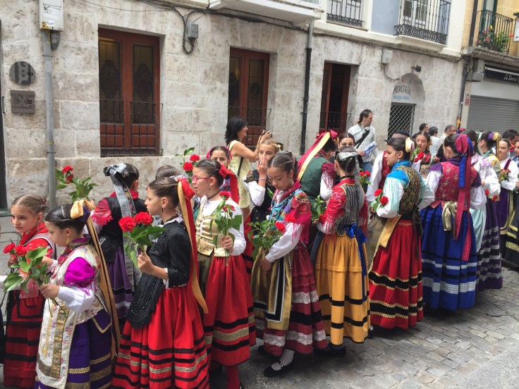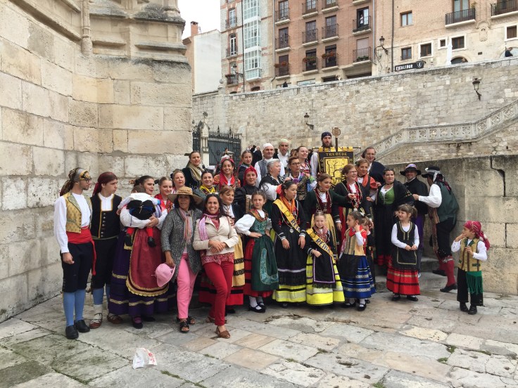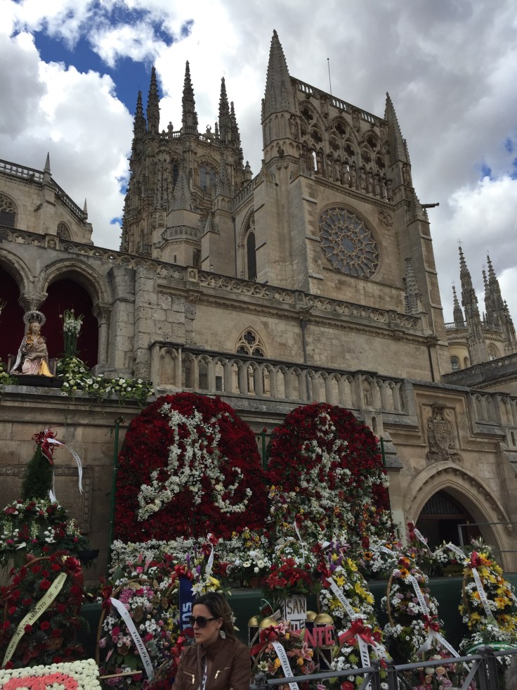 Via een mooi pad langs de rivier lopen Alice en ik Burgos binnen. O jee. We wisten dat hier een feest was, maar dit is heel heftig. Het feest van Petrus en Paulus duurt vier dagen, we zijn er nu op de eerste dag. We zien allemaal mensen in de prachtigste kleren. In een grote stoet, vanuit alle straten met bloemen op weg naar de kathedraal.