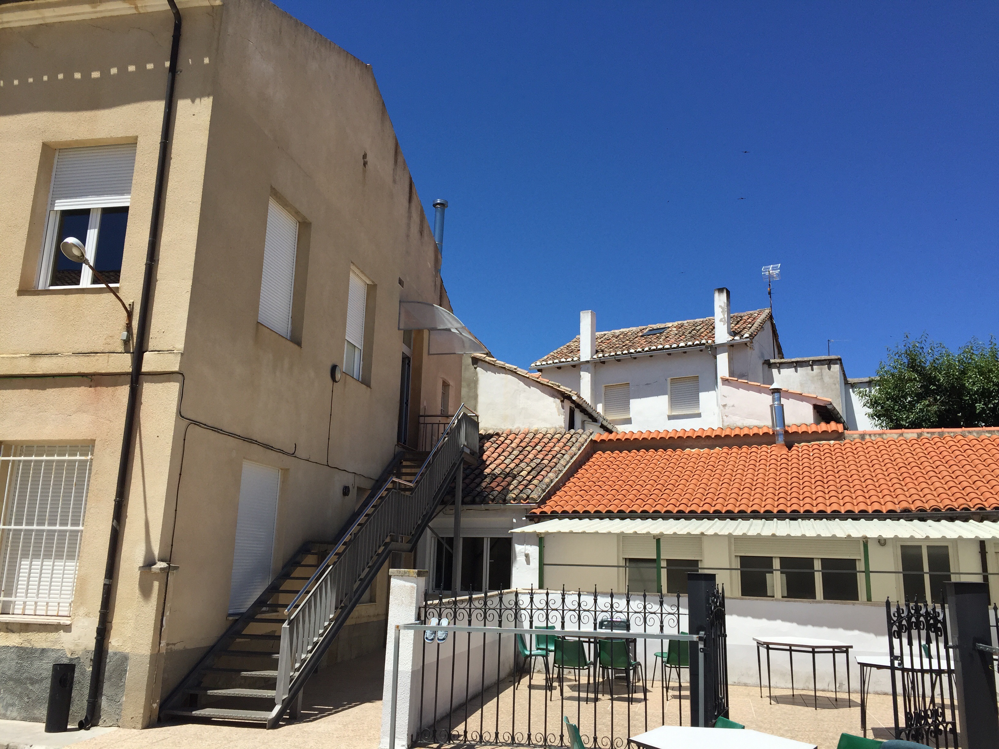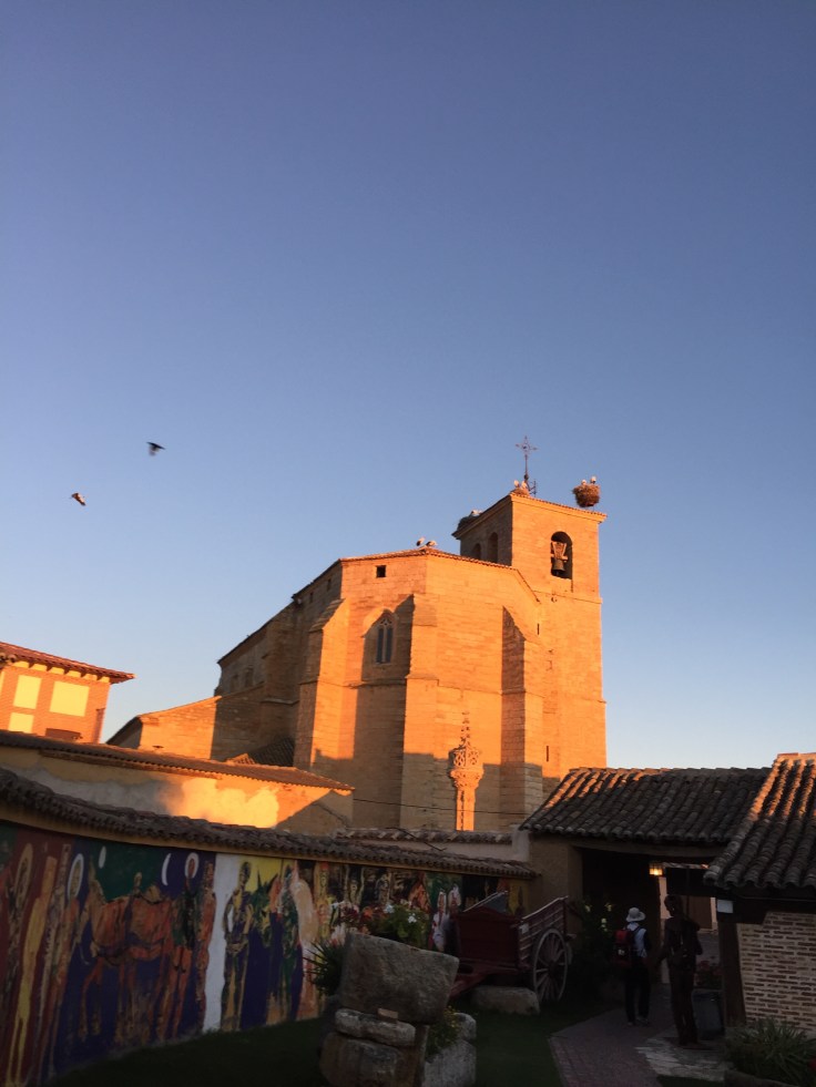 De lange hete wandeling wordt steeds zwaarder. Niet alleen de hete zon, maar vooral door gebrek aan afwisseling. Gelukkig komen pelgrims langs en dan begin je maar gewoon te kletsen. Nog steeds is Mariana mijn wandelmaatje. Ze is relaxed en de gesprekken verlopen moeizaam in langzaam Frans, maar zijn wel interessant als we het hebben over onze families, jeugd-herinneringen, drama’s in het leven en vriendschappen. Haar vader is kort voor de Camino overleden. Urenlang, dagenlang loop je naast elkaar of loop ik vooruit en zie haar later weer tijdens een rustpauze. Belangrijkste verandering tijdens de wandeling is dat de kilometerpaaltjes steeds een cijfertje lager aangeven richting 0 km. Eindelijk zijn we aangekomen bij de herberg van de Espíritu Santo, een groot kloostergebouw.