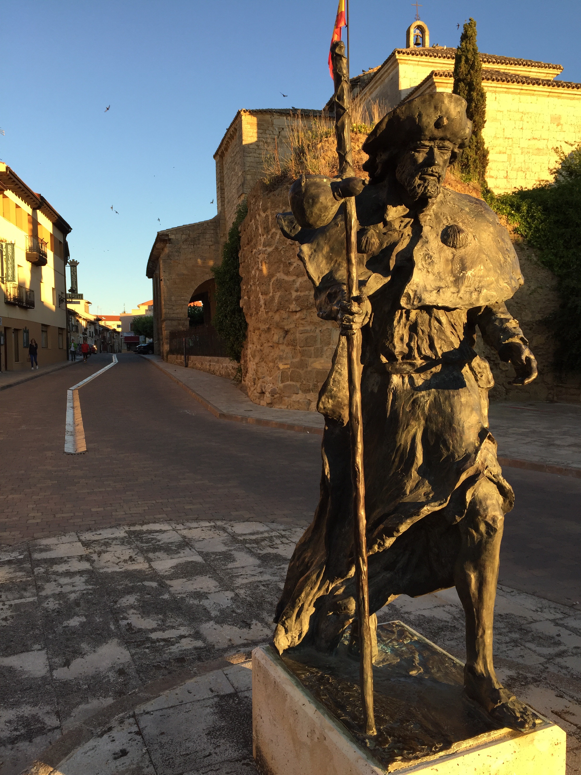 Vertraagde start door moeilijke afspraken met bagagevervoerder voor Mariana en ontbijt in lokaal café dat erg lang duurt. Eerste stappen buiten het café en ja hoor, de eerste pelgrim van ijzer staat al weer voor onze neus. Bijzonder mooi.