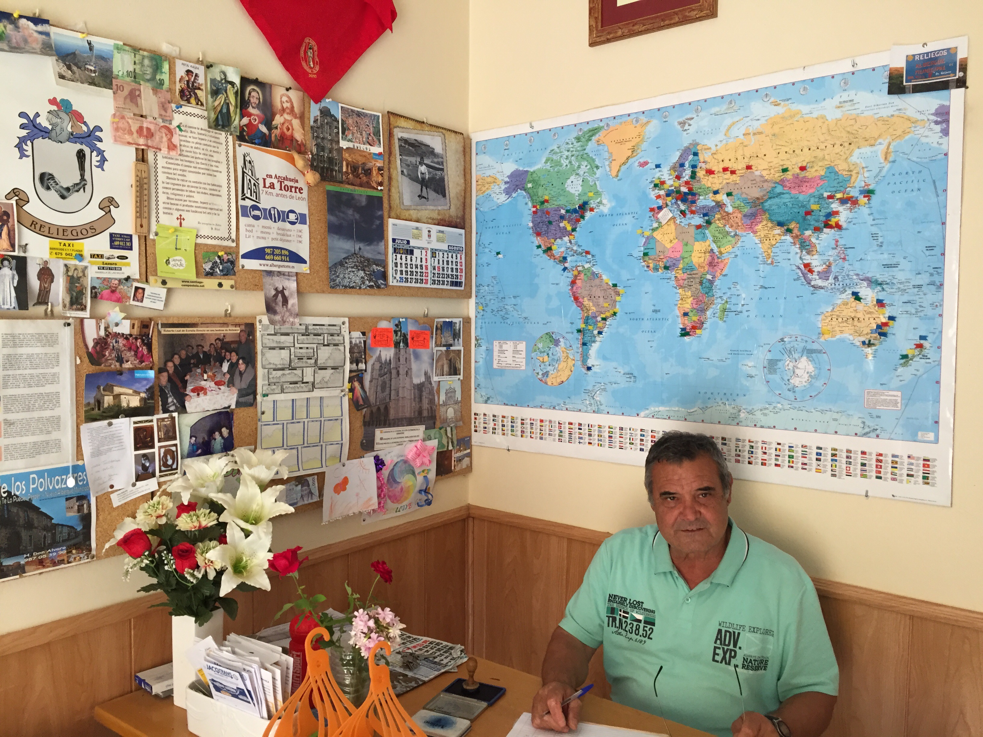De beheerder (al 20 jaar) van de gemeentelijk pelgrimsherberg in Reliegos achter zijn bureau