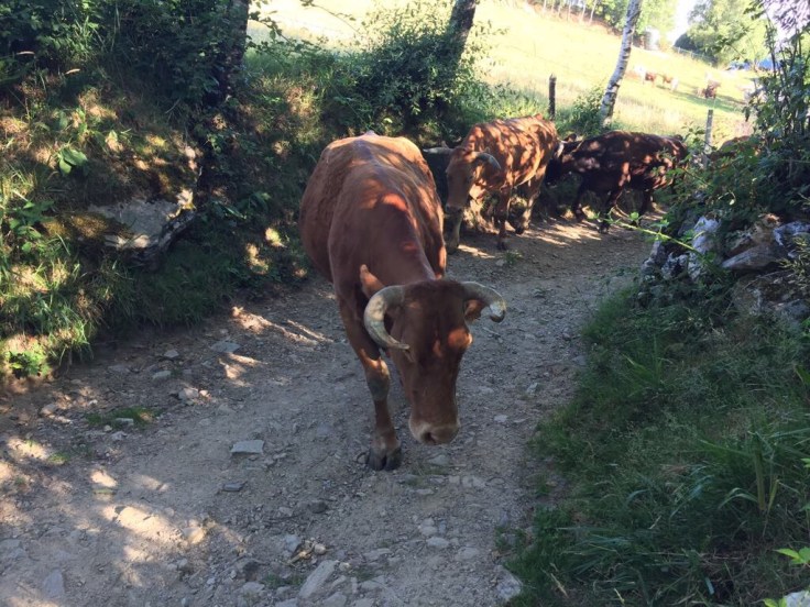 Dan beginnen de afdalingen en ook vlakke stukken door dorpen waar de straatjes vol liggen met koemest. Onderweg komen we geregeld terecht tussen de koeien die naar de wei worden gebracht. Het zijn toch wel flinke beesten, als ze op je afkomen.