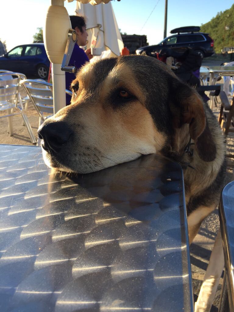 Na een zeer forse klim komen we op pashoogte terecht bij een terras waar veel pelgrims hun ontbijt nemen. Inka krijgt gezelschap van een Galicische herdershond.