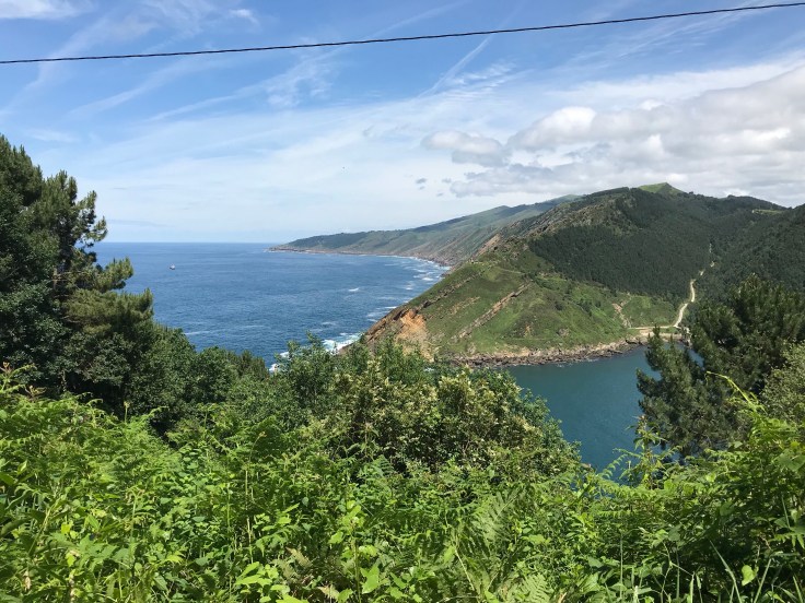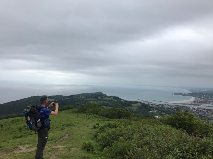 Kletsnat stijgen we richting de top van de Jaizkibel (545m) in een bosrijke groene omgeving en krijgen langzaam de eerste vergezichten te zien. Het blijft maar miezeren.