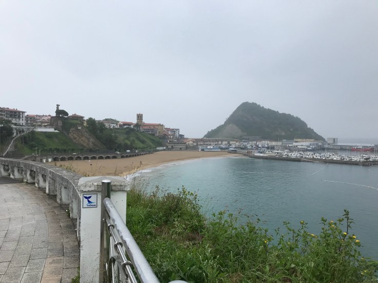 De binnenstad van Zarautz is nog vrijwel leeg als mijn zwager Albert mij afzet voor de pinautomaat. Het heeft geregend en daar houden ze hier niet van, dus amper mensen op straat. Met een volle portemonnaie ga ik op zoek naar de gele pijlen; de Camino start vandaag op een mooie verharde weg langs / boven de zee. In de regen.