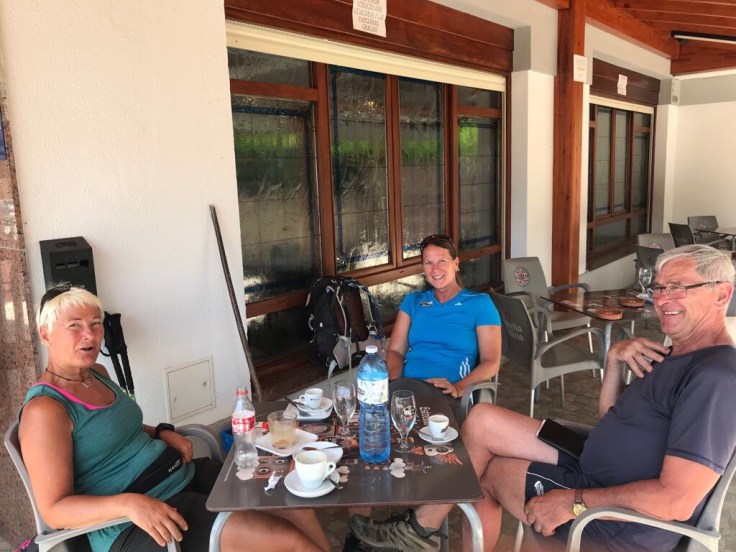 Na een lange tocht langs hoge berghellingen waarin het witte gesteente weer het landschap kleurt, kom ik eindelijk terecht in een klein plaatsje waar zelfs een kruidenier is die zich supermarket noemt. Water, fruit en mueslirepen gekocht. En dan weer verder todat ik op 10 km van de bestemming bij een terrasje aanbeland waar ik Sulla, Jean-François en de Amerikaanse Karin ontmoet. Heerlijke bak koffie.