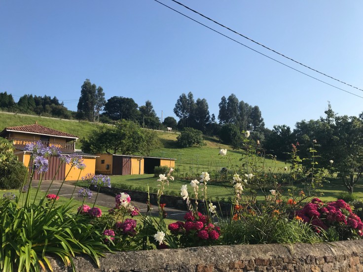 In Salinas op ca. 7 km dreig ik de weg kwijt te raken op meerdere tijdstippen. Blijkbaar is dat bekend dat pelgrims hier zoeken, want automobilisten helpen je al bijvoorbaat door vanuit hun auto de goeie weg te wijzen. Ook word ik een 400m. min of meer bij de arm genomen door een grote Spanjaard. Ik zie ondertussen een gele pijl op een lantaarnpaal die de andere kant op wijst. Hij legt uit dat we parallel lopen aan de goeie weg. Gelukkig heeft hij helemaal gelijk en zo kom ik buiten het dorpje waar ook Ricardo loopt. Hij heeft vakantie genomen om in een paar weken naar Santiago te lopen. Het valt hem zwaar. Nog niet zoveel kilometers in de benen. Ik loop sneller, dus we wensen elkaar Buon Camino. De mensen hier hebben prachtige bloementuinen.