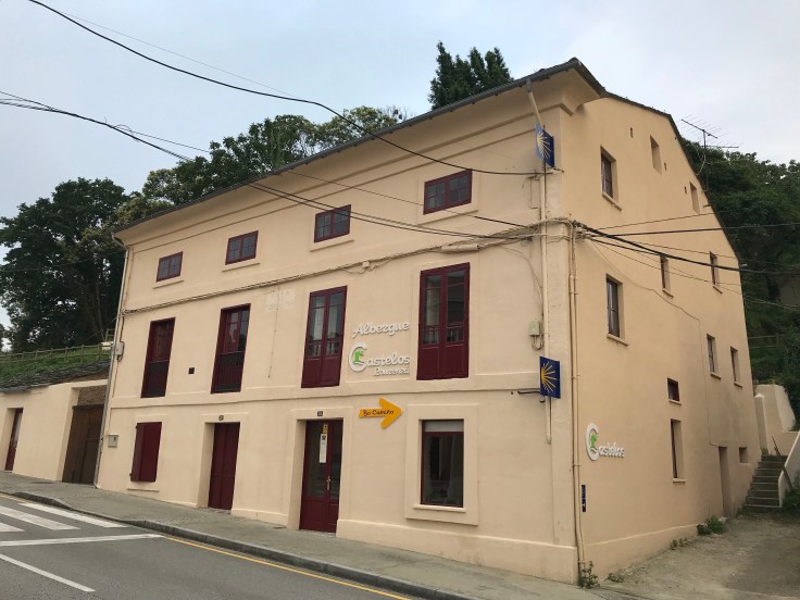De herberg ligt aan de hoofdstraat van het dorp. Aan de zijmuur, onder Castelos, hangt het Santiago-symbool dat je daar langs moet, naar boven de helling op van een flinke heuvel.