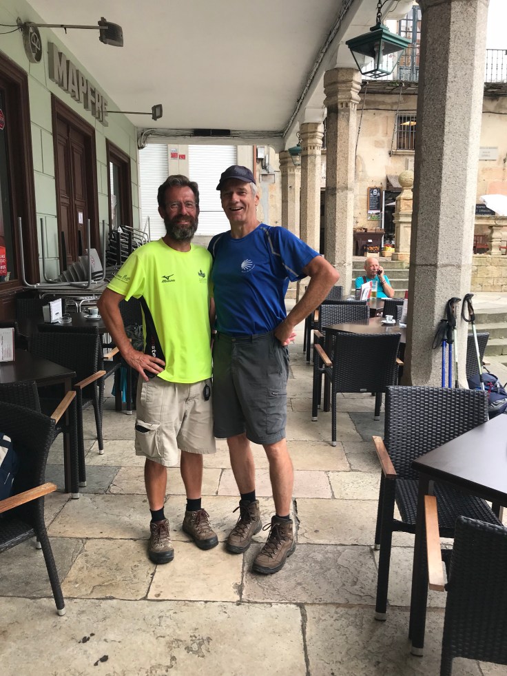 Zo loop ik urenlang alleen door dit glooiende landschap, tot ik eindelijk weer in een klein stadje arriveer. Op het kerkplein zie ik alle bekende pelgrims zitten met hun grote rugzakken op het terras van het café. Een ouder Duits echtpaar, Clement de beginnende fluitist met rasta, de oude Franse tennisfan en ook weer Philippe die hier in Mondoñedo heeft geslapen. We kennen elkaar nu zolang dat we samen op de foto moeten.
