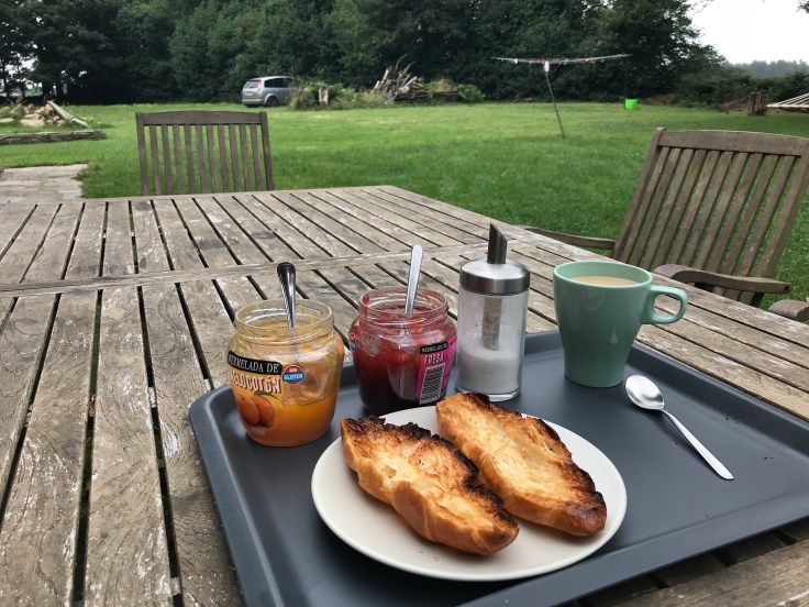 Deze nieuwe albergues zijn nog niet bekend in de boekjes van de pelgrims. Daarom doen zij extra hun best om het ons naar de zin te maken. Ik vroeg om een koffie met croissant. De croissant is hier niet krom. Hij is dwars doormidden gesneden en in de broodrooster gezet. Krijg ik er ook nog twee potjes jam bij. Na deze pauze word ik nog rondgeleid in de herberg, erg leuk van binnen en ook buiten in de tuin. Om de herbergier niet teleur te stellen, heb ik afscheid genomen met een ‘tot volgend jaar’.