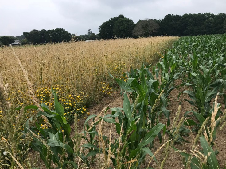 Het blijft toch vooral een cultuurlandschap vandaag. De natuur is ver weg en hier zie ik allerlei kleinschalige akkerbouw en weilanden met een stuk of wat koeien die het prima naar de zin hebben. Ik kom weer korenvelden tegen, gouden golvende graanvelden! Waar vind je die nog in Nederland? Bij ons zijn ze vervangen door 2 meter hoge maïs. Nou, hier rukt de maïs ook op.