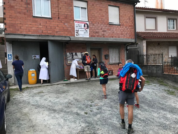Kort ontbijten in het café en dan snel het stadje uit. Bij de laatste albergue van Arzúa zie ik de eerste pelgrims alweer stoppen. Voor de herberg staan een paar nonnen in het wit aan een tafeltje waar je een stempel kunt krijgen voor je pelgrimspas.