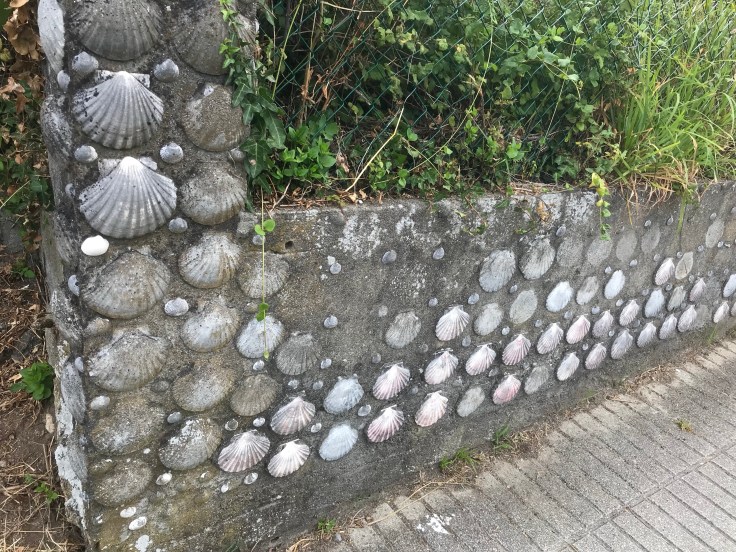 En als je denkt dat na Santiago het pelgrimsverhaal vergeten is, dan doen de schelpen onderweg je hier wel anders over denken. Zoals in het tuinmuurtje.