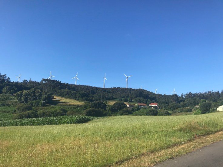 Het gaat veel op en neer en daardoor is het best wel een zware dag. Na een uur of 11 begint de zon steeds feller te schijnen, maar het gaat ook meer waaien. Een verfrissende bries vanuit zee, want de kust komt onderhand dichterbij. De Spanjaarden hebben daar gebruik van gemaakt en langs de hoge horizon zie je en hoor je metershoge windmolens hard hun best doen.